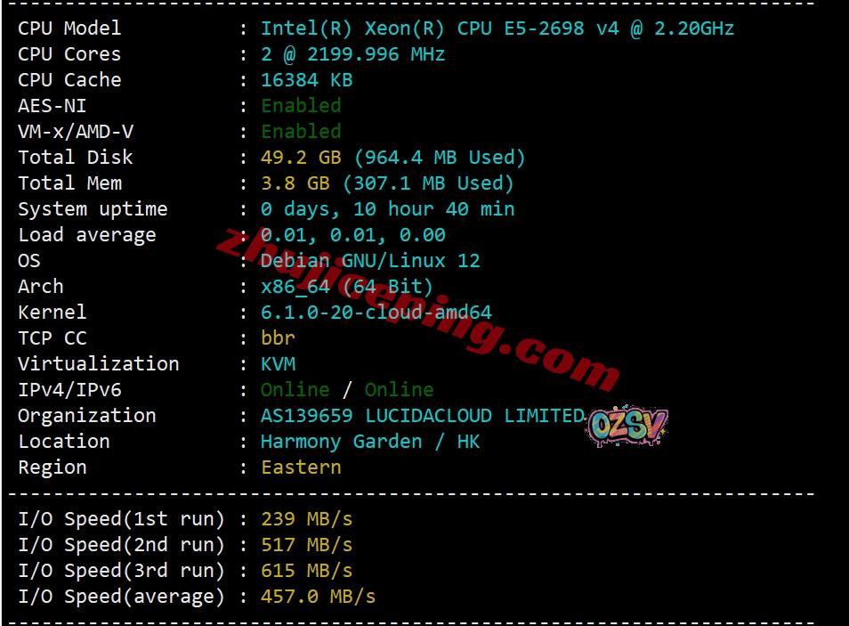 服务器用的CPU型号为(通常上双路,那就是40核、80线程、主频2.2GHz、加速3.6GHz),站长启用了BBR,支持IPv6,野草自己的网络,归属地香港,当前硬盘I/O测试大致在457MB/S的样子: