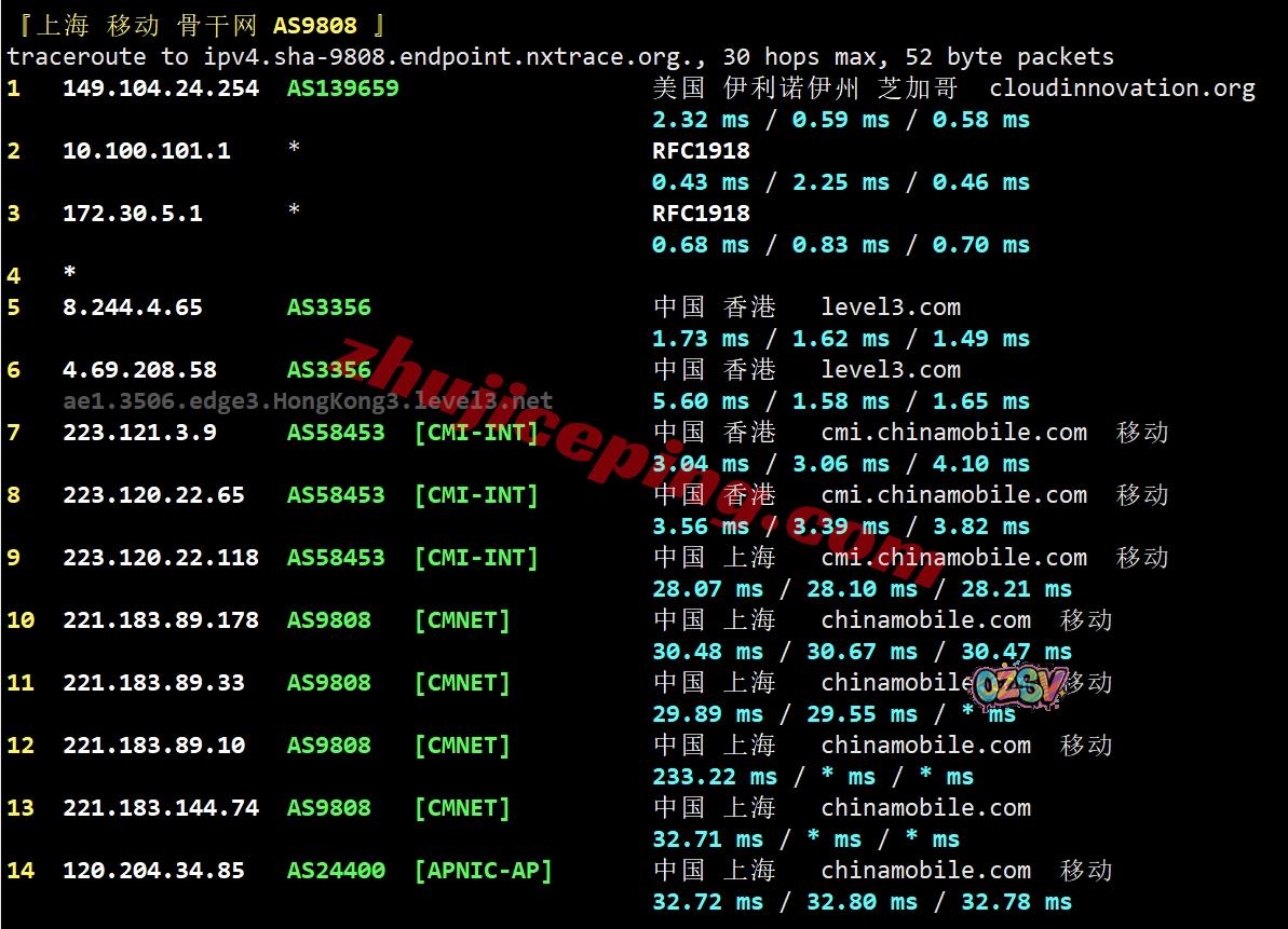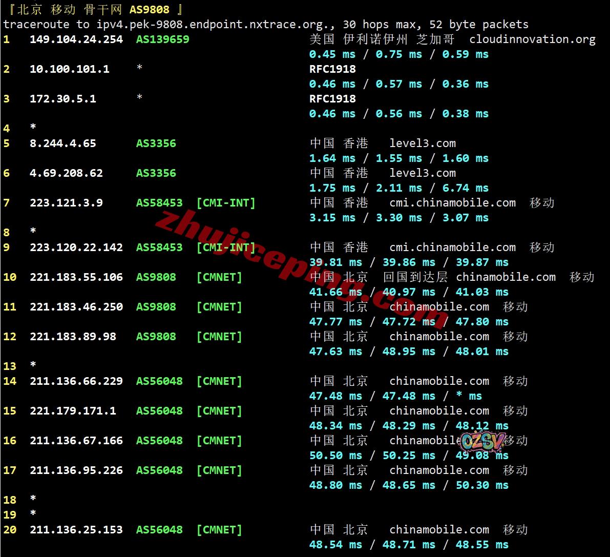 移动去程:移动直连香港CMI然后转NTT去机房