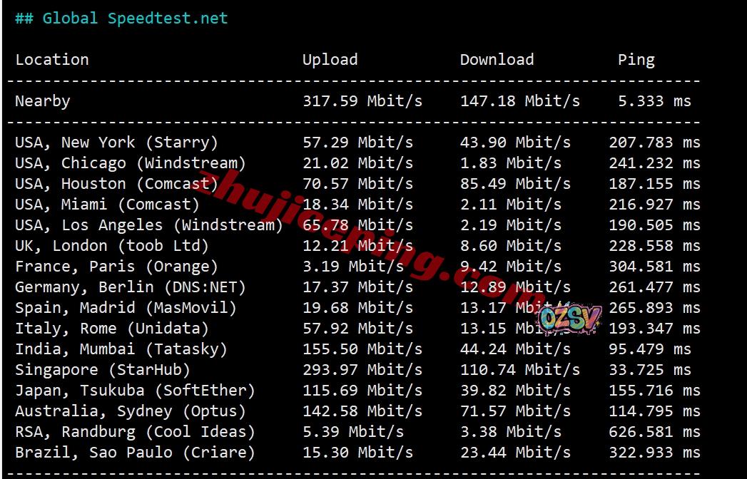 speedtest.net部分国际节点的测试数据如下: