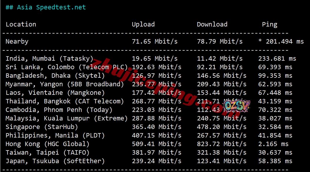 speedtest.net的亚洲部分节点测试数据: