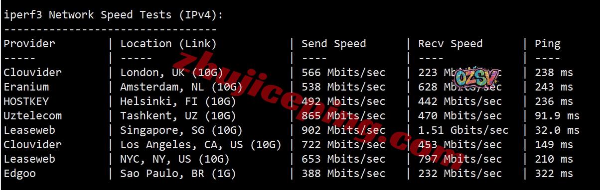 默认1Gbps带宽,大陆三网多节点的上下行带宽测试数据: