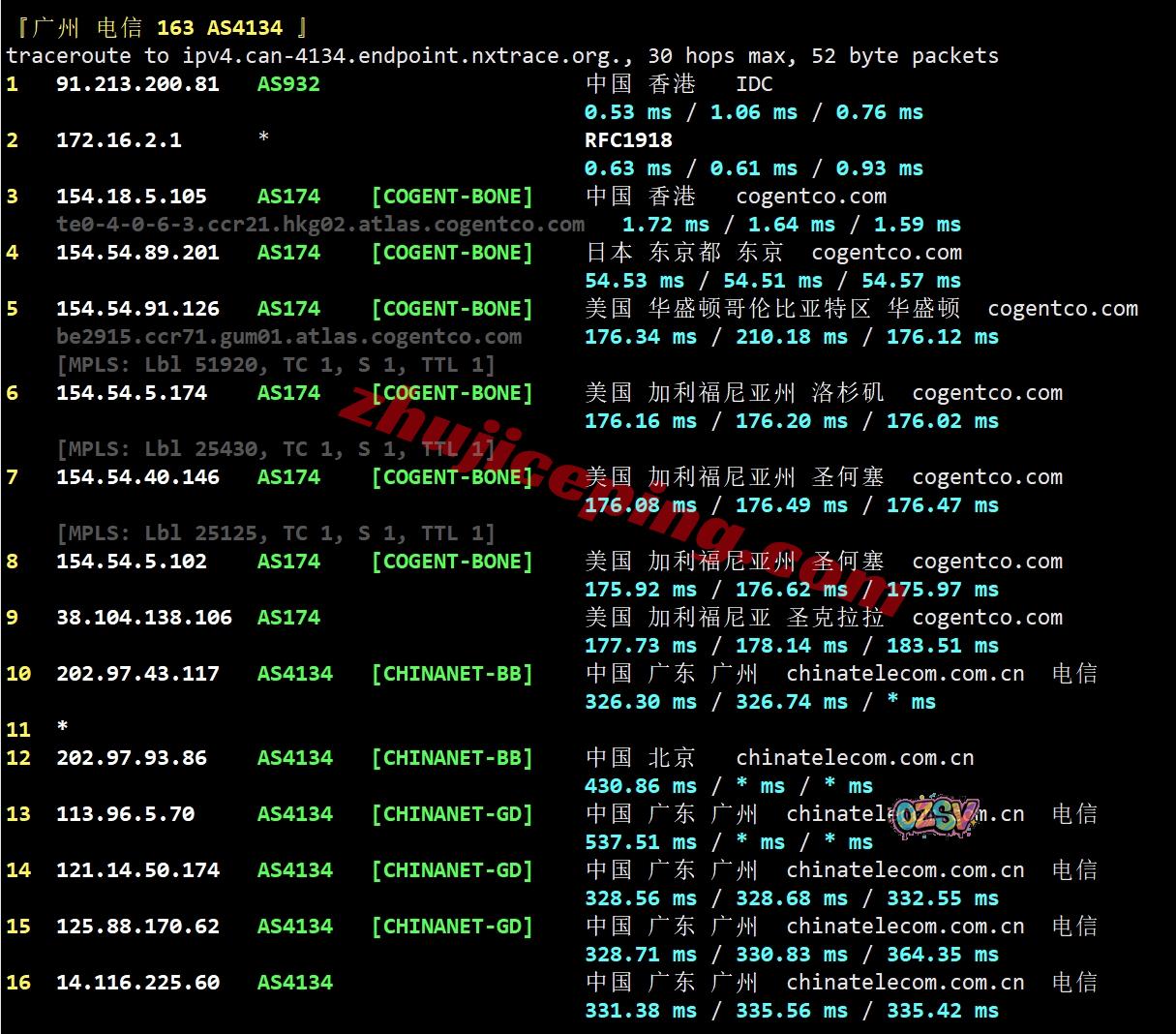 电信去程:直连电信圣何塞节点,然后转cogent在西海岸返回出海到香港