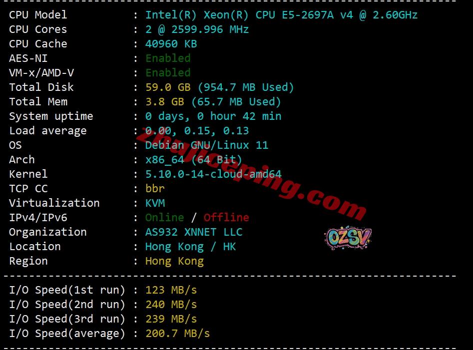 服务器用的CPU型号为双路e5-2697A V4(32核、64线程、主频2.6GHz、加速频率3.6GHz),启用了BBR,不支持IPv6,当前测试I/O大致200MB/S;