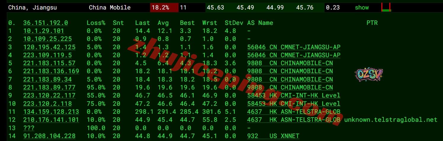 移动去程:移动骨干CMI直连香港接Telstra去机房