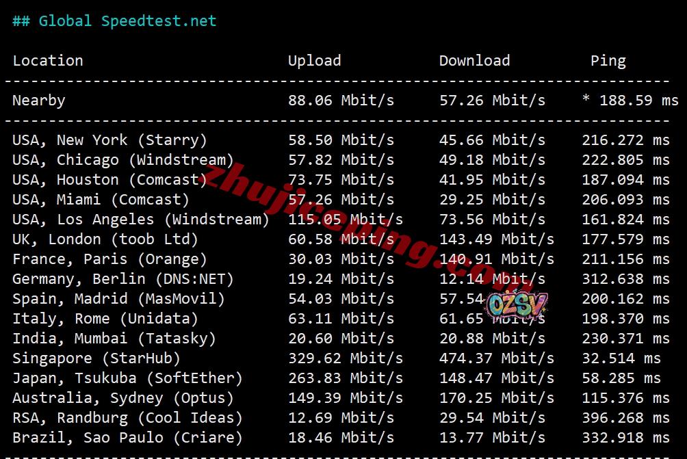 speedtest.net的部分国际节点测试数据:
