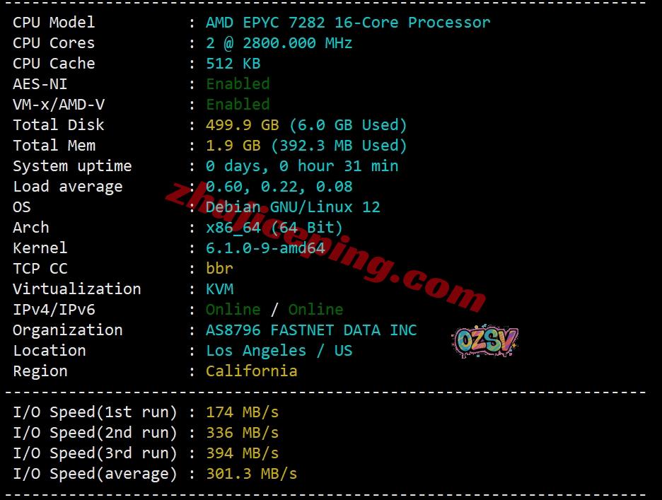 zgovps的美国洛杉矶机房最近上了“Los Angeles Storage VPS”系列,也就是大家说的大硬盘vps/存储vps。默认采用KVM虚拟,AMD EPYC 7282、DDR4、硬盘raid10阵列、1Gbps带宽、自带一个IPv4+/64 IPv6,美国原生IP。由于当前有特价促销,性价比看起来非常高,本站QQ群内也有一些人买了,这里站长来分享下实测数据,仅供大家参考。