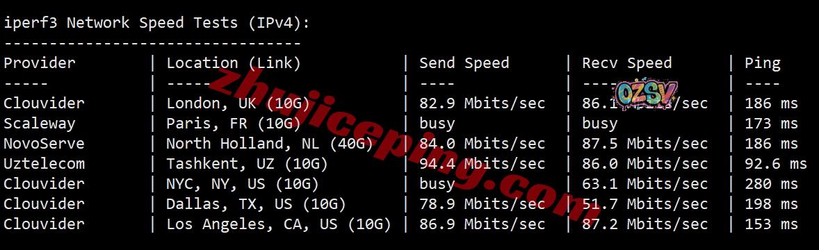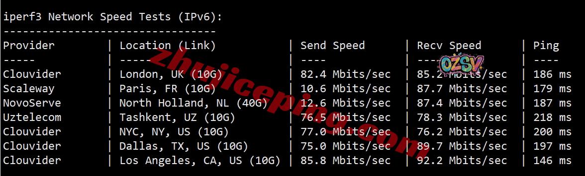 iperf3,IPv6环境下,几个欧美节点的测试数据: