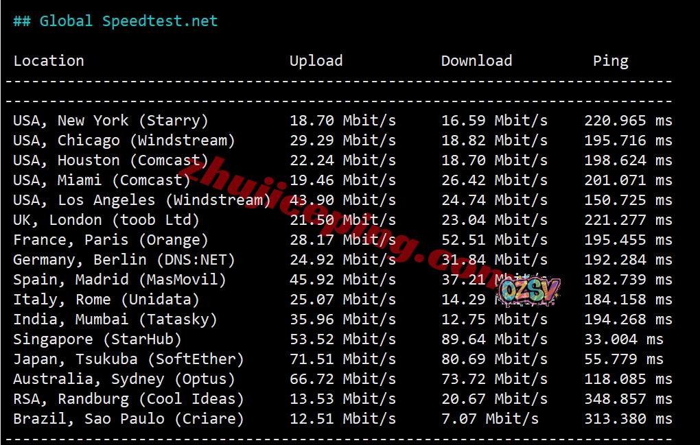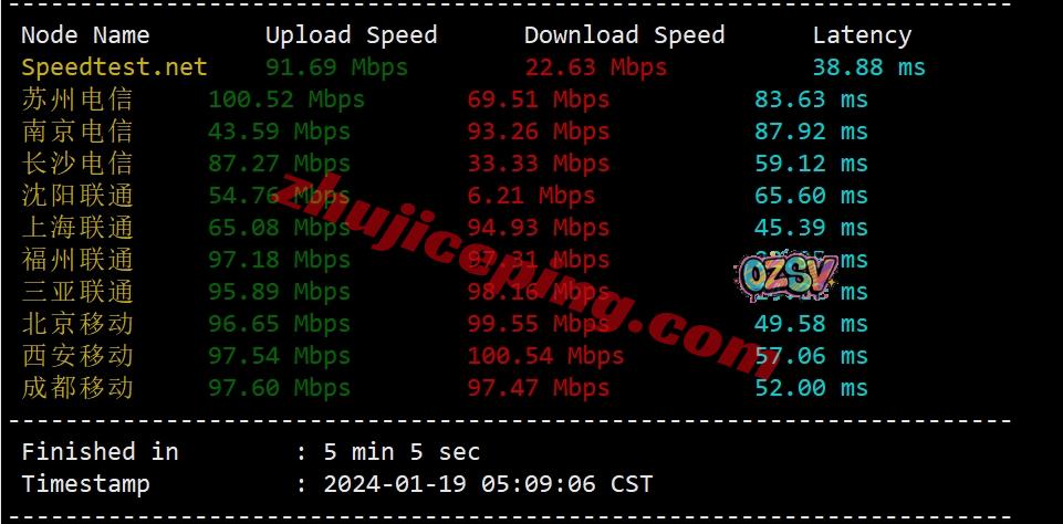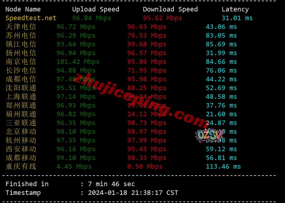 默认100Mbps带宽,我们用大陆境内的三网多节点跑一圈上下行测试下: