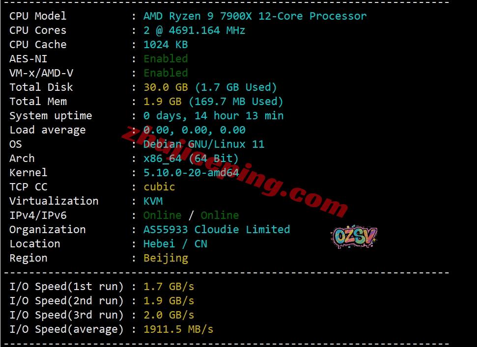 AMD Ryzen 9 7900X,12核、24线程、主频4.7GHz、加速频率5.6GHz;支持IPv6,当前硬盘I/O大致1911MB/S的样子: