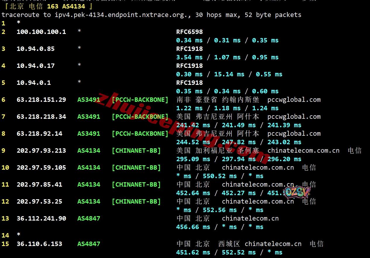 北京方向:走pccw去美国阿什本然后去电信圣何塞节点,然后直连回国