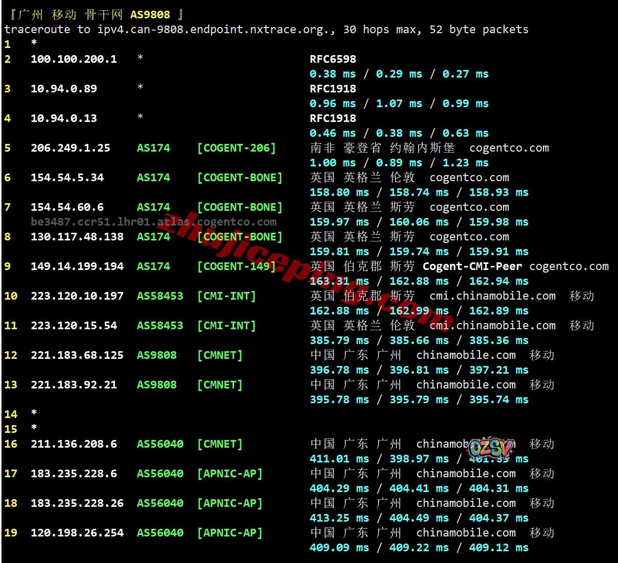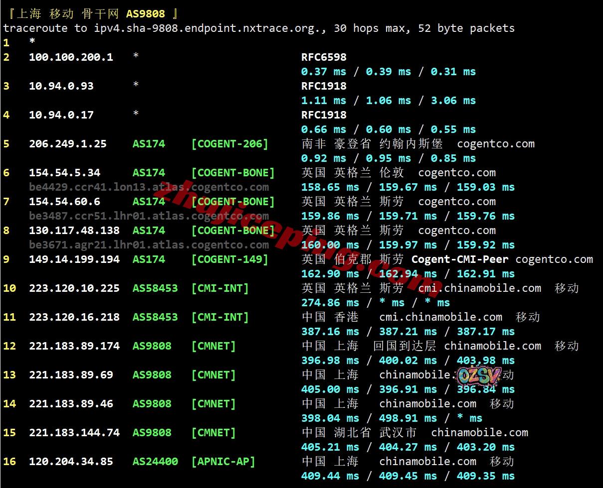 上海方向:走cogent去英国,从移动与cogent在英国伦敦的peer转移动英国CMI节点,然后直连回国