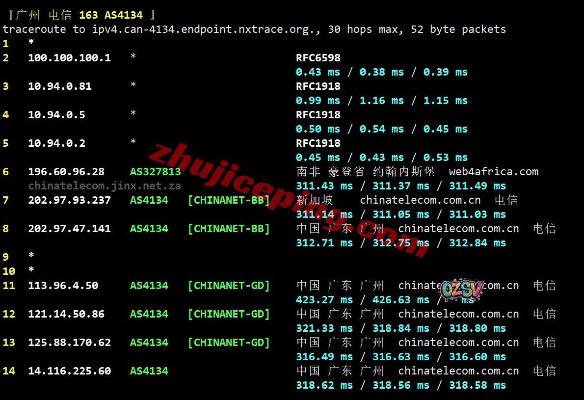 广州方向:从电信在南非jinx.net.za的peer出来直连电信新加坡节点然后直连回国