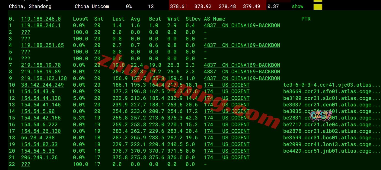 联通去程:直连联通圣何塞节点然后走cogent横跨美国从东海岸奥尔巴尼出海去欧洲,经过英国去南非