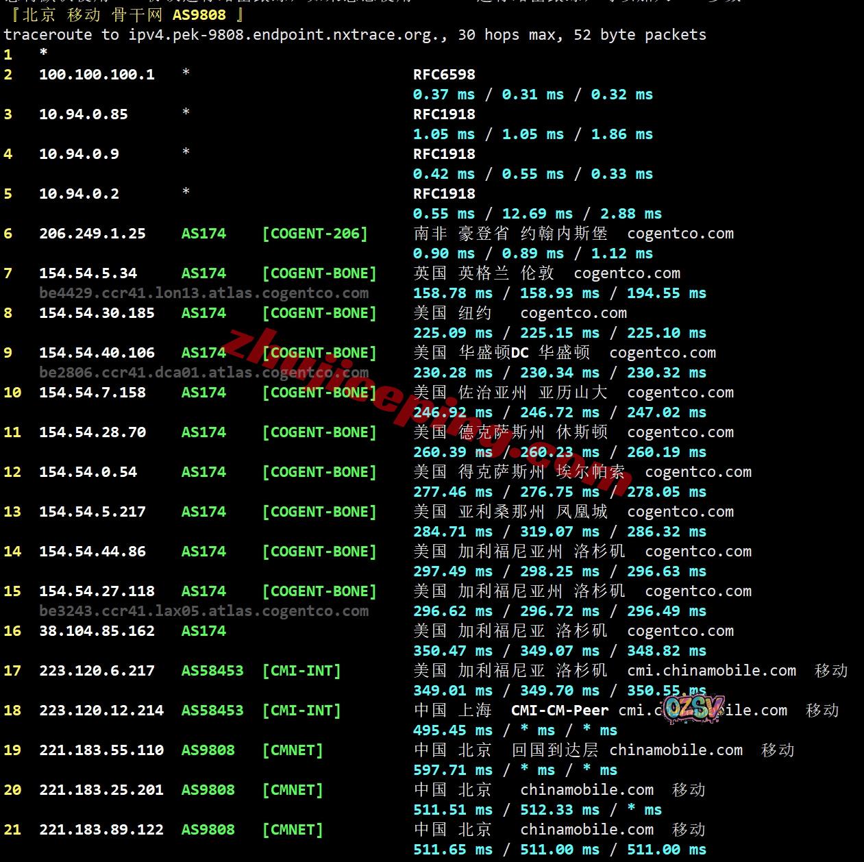 北京方向:走cogent经过伦敦去美国纽约横穿去洛杉矶,从移动洛杉矶节点直连回国
