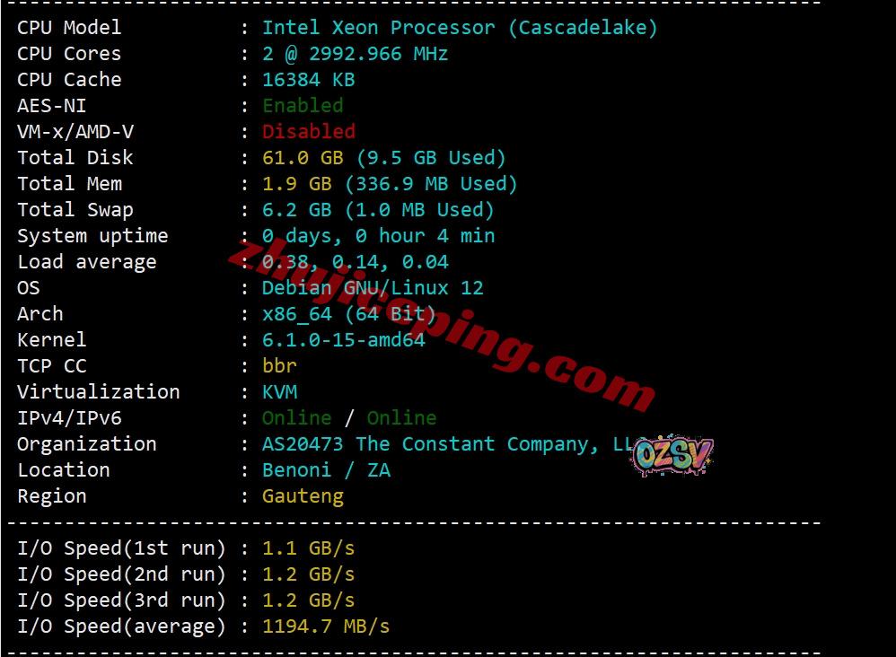 CPU型号未知,主频大致3.0GHz(cascadelake),站长启用了BBR,支持IPv6,IP归属南非gauteng,当前I/O测试结果大致1194MB/S