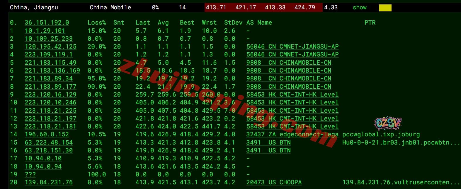 移动去程:直连移动英国伦敦节点,然后直接去移动非洲节点,再去移动南非节点…