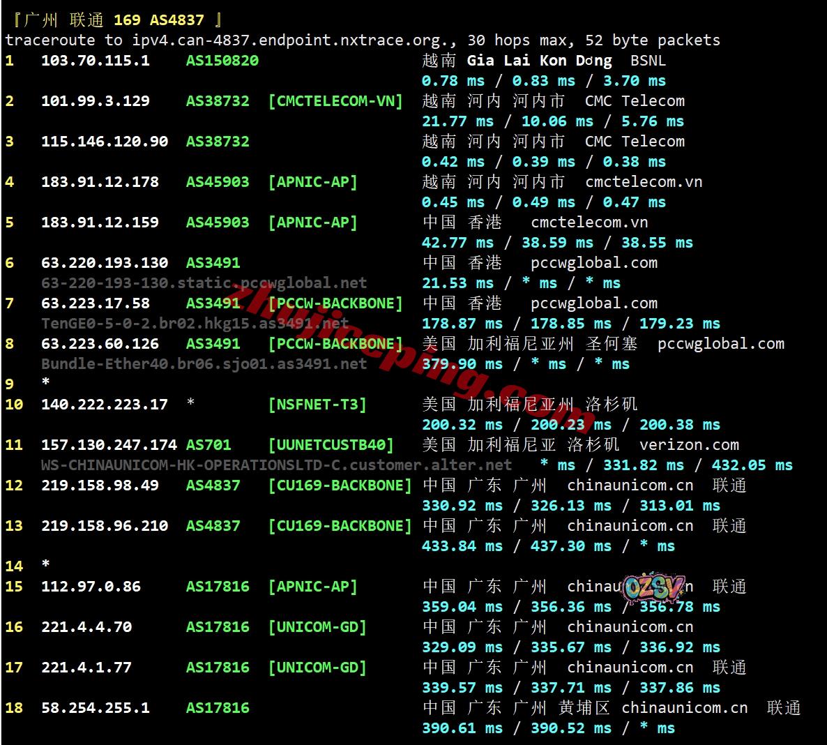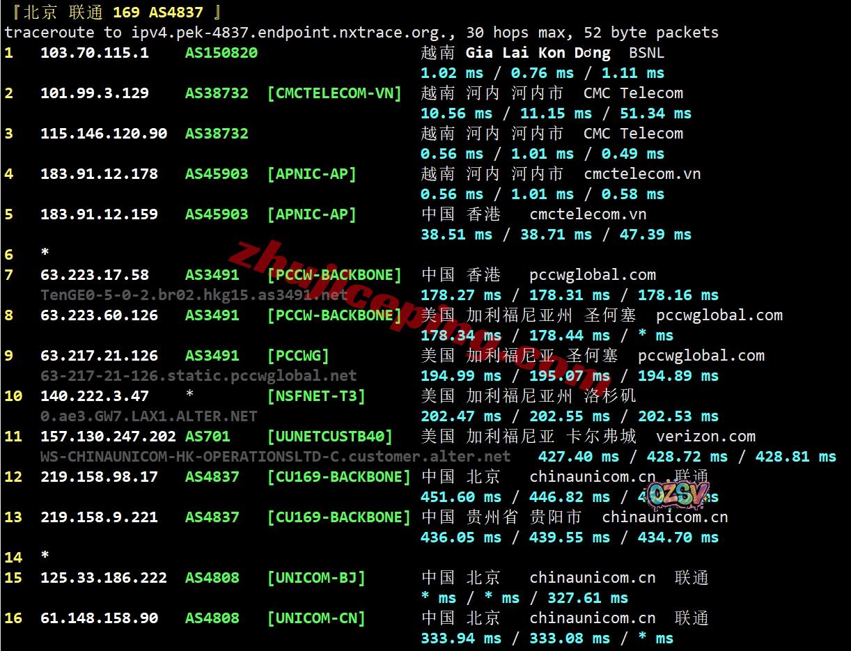联通回程:越南cmctelecom直连香港转pccw去美国西海岸,从联通与alter.net在加州的peer直连回国