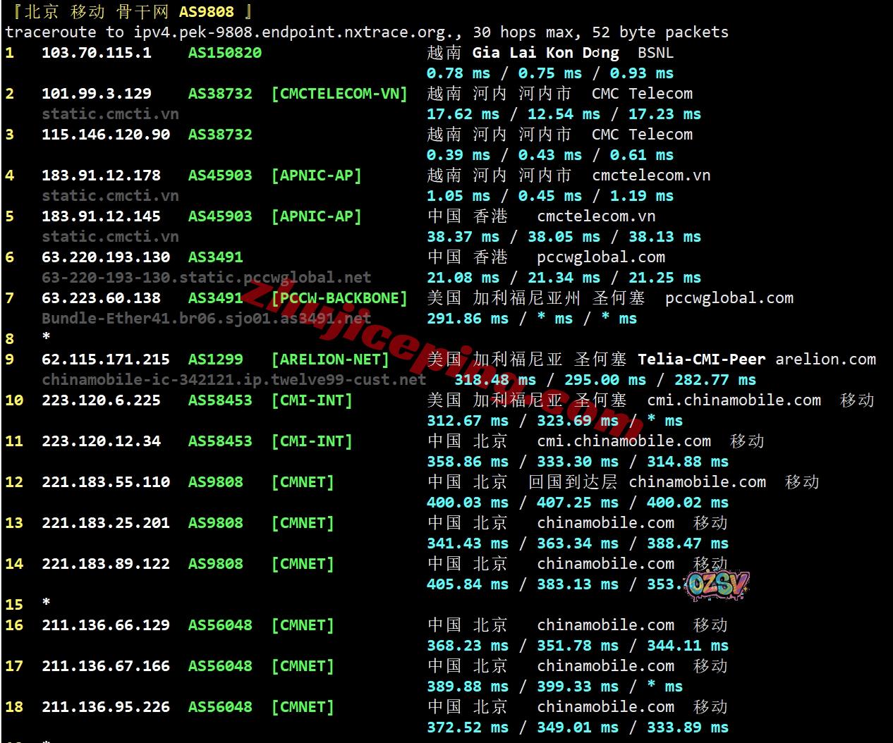 北京方向:越南cmctelecom直连香港然后转pccw去美国,从移动与telia在圣何塞的peer出来直连回国
