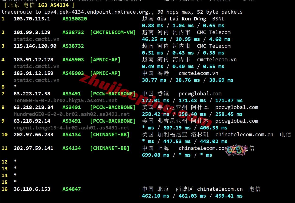 北京/上海方向:越南cmctelecom直连香港然后转pccw去美国东海岸,从电信西海岸节点直连回国