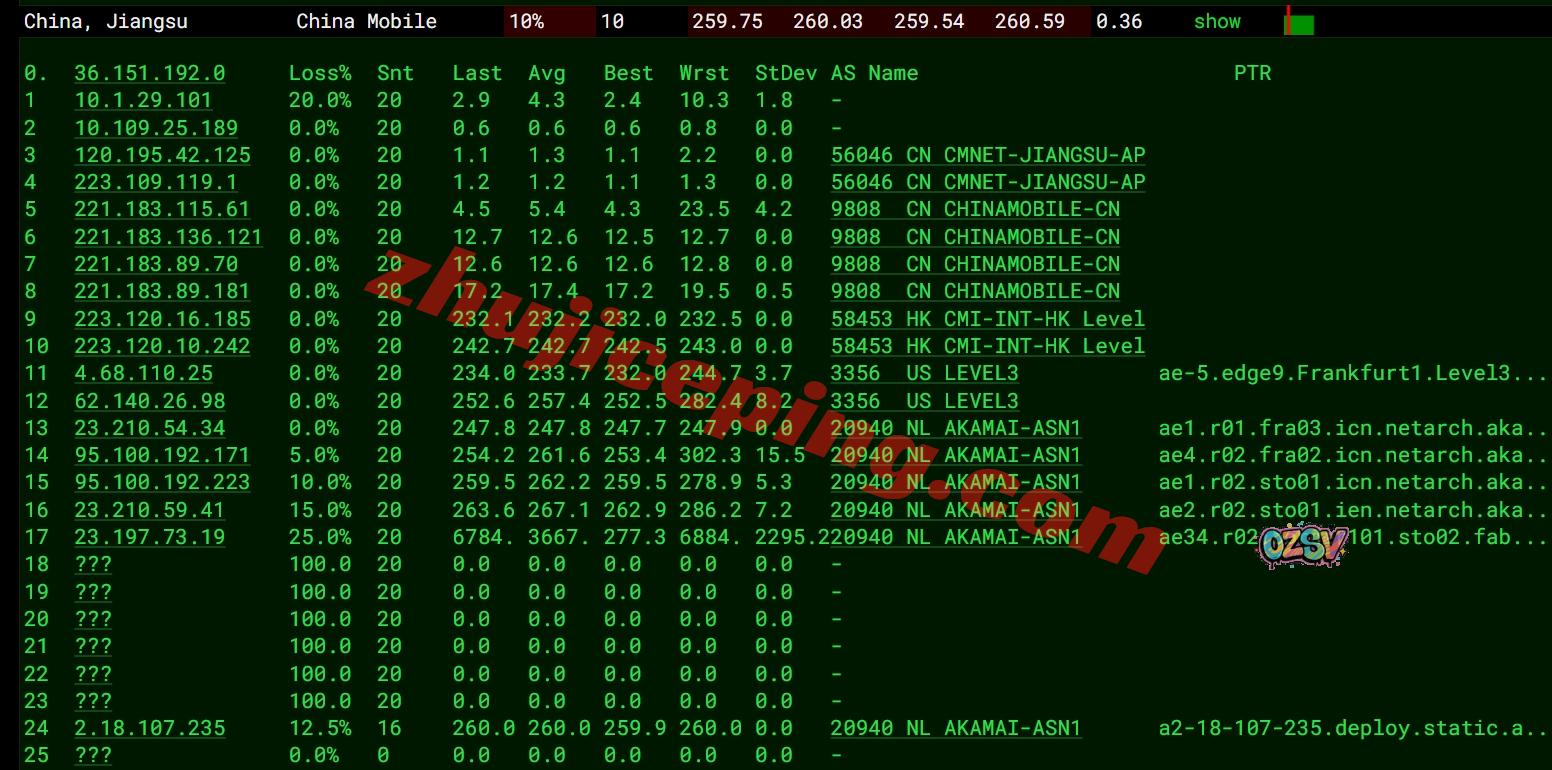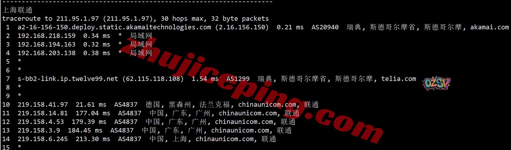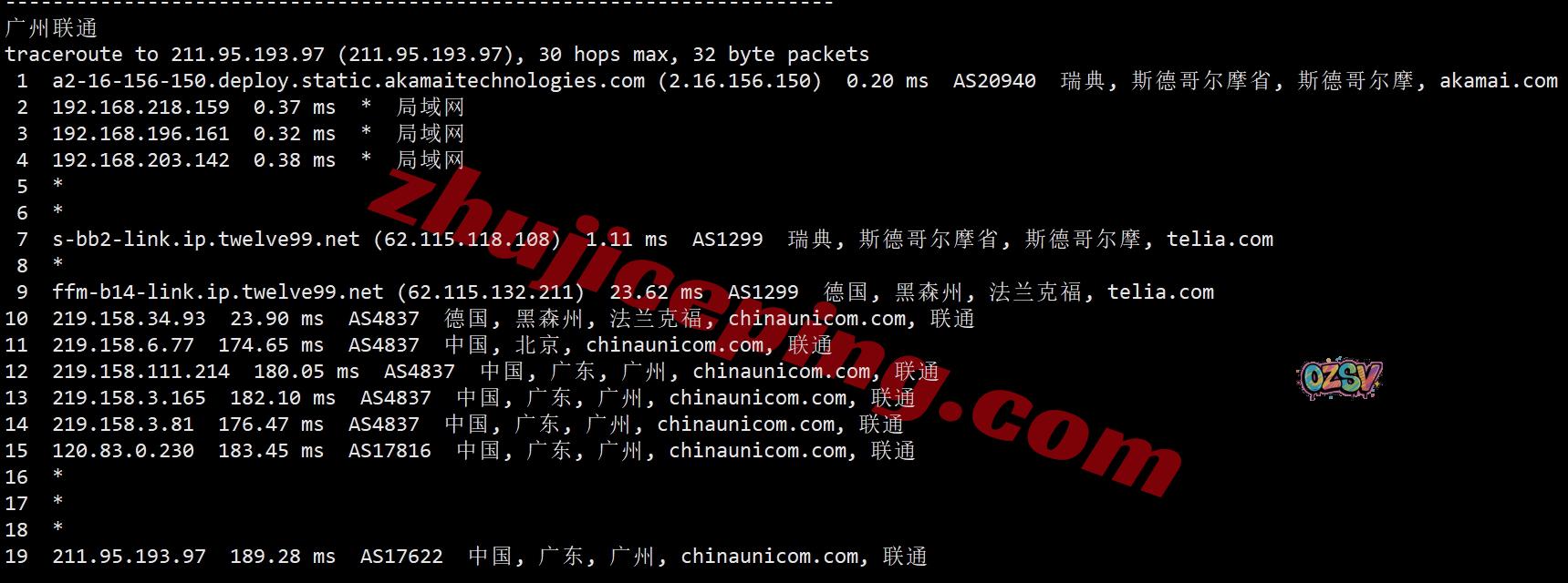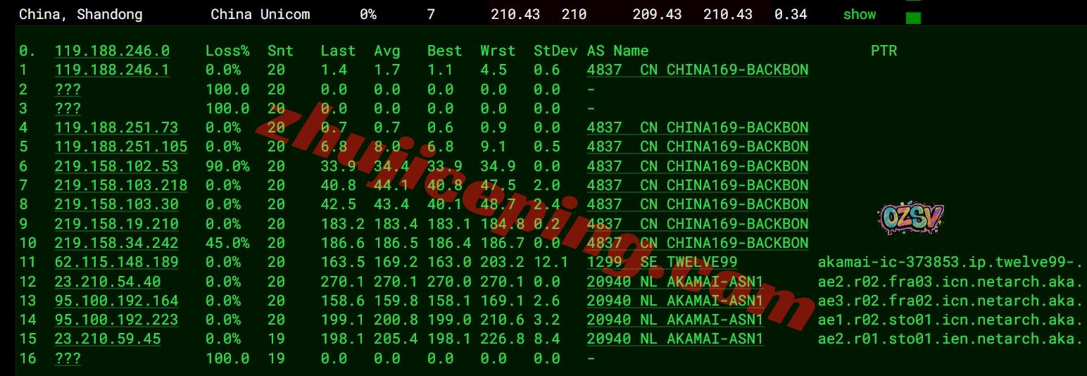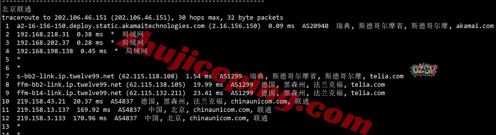 联通去程:直连联通德国法兰克福节点,然后走twelve99接akamai自己的网络去瑞典