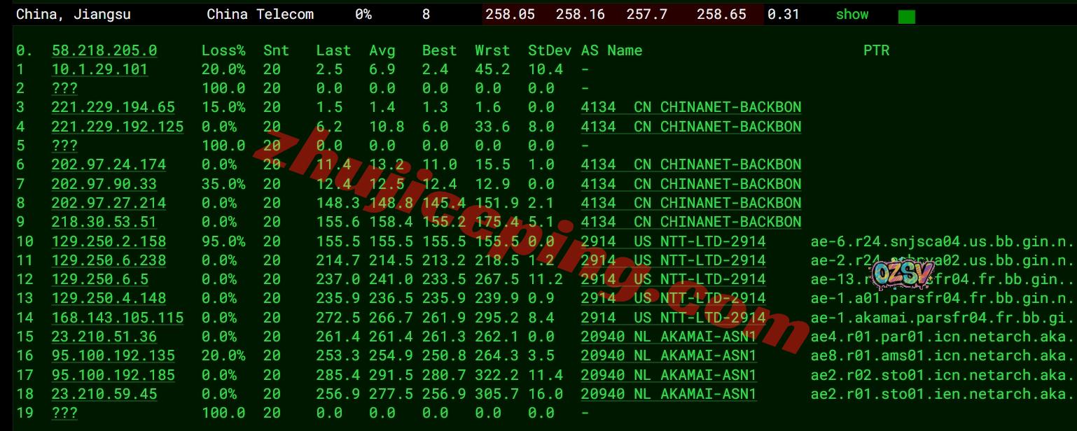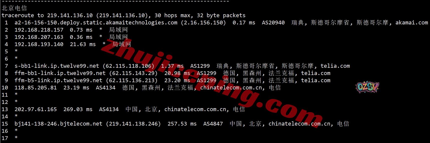 北京方向:走telia经过德国法兰克福,从电信法兰克福节点直连回国