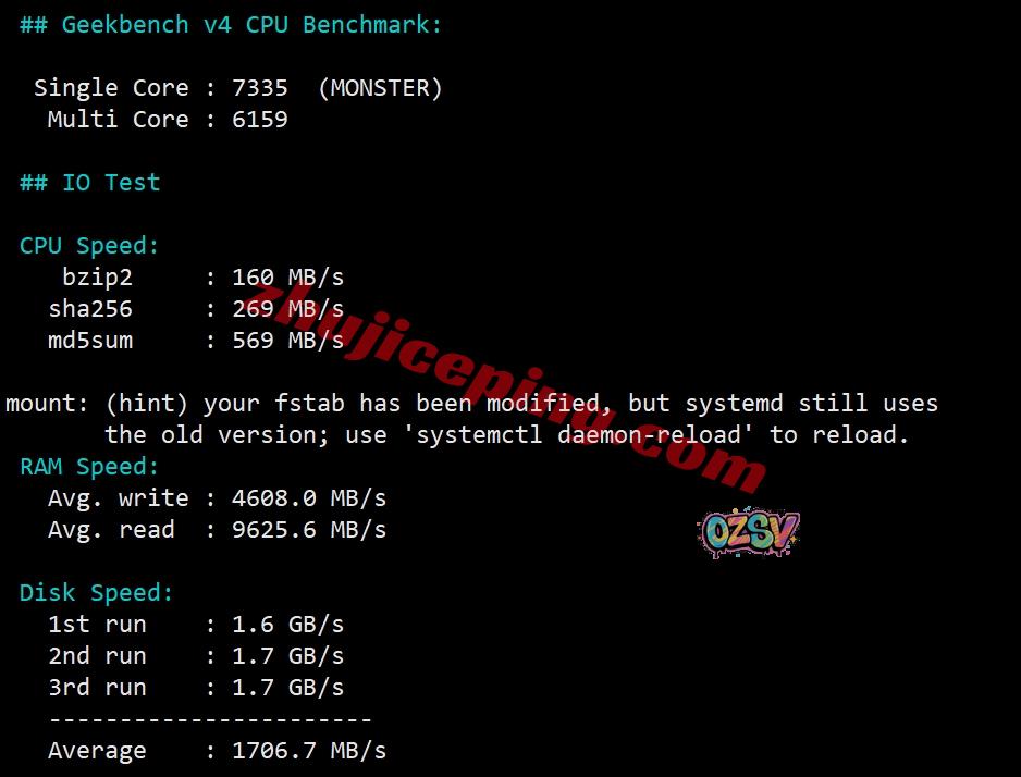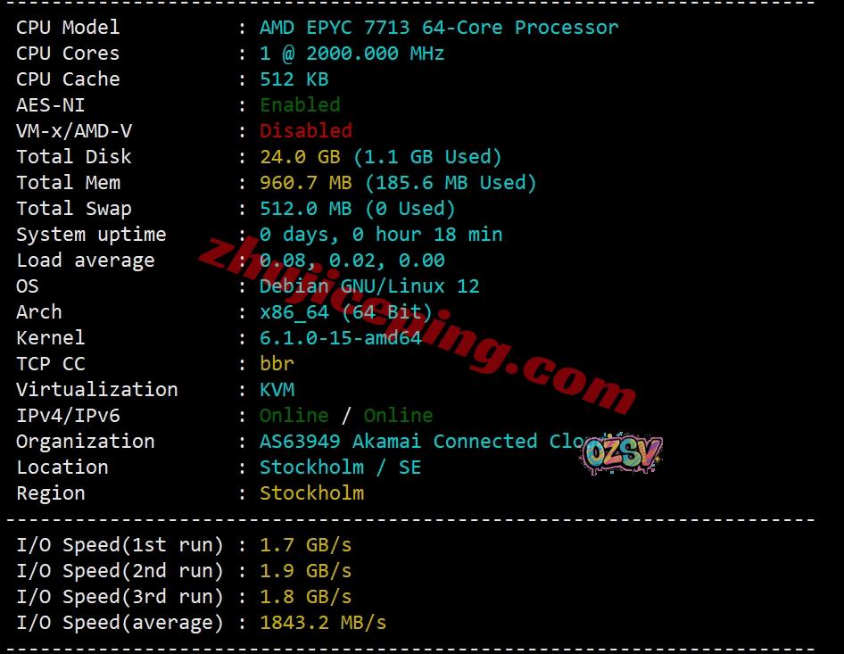 AMD EPYC 7713(64核、128线程、主频2.0GHz、加速频率3.675GHz),站长启用了BBR,支持IPv6,IP归属瑞典斯德哥尔摩,当前硬盘I/O大致1843MB/S: