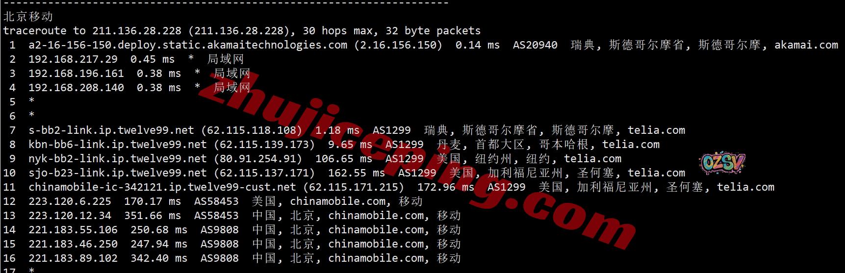北京方向:走telia经过丹麦、美国东海岸-西海岸,从移动圣何塞节点直连回国
