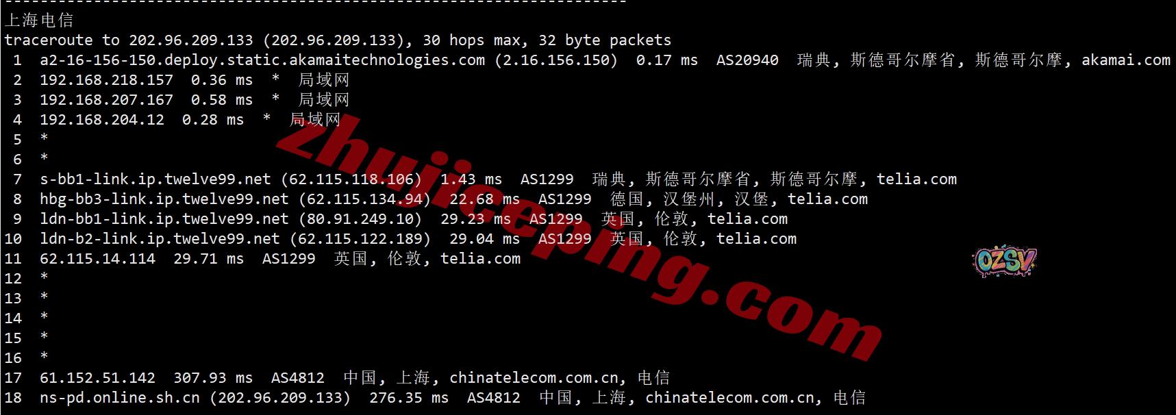 电信去程:直连电信圣何塞节点,然后走NTT经过阿什本出海去法国、荷兰再到瑞典