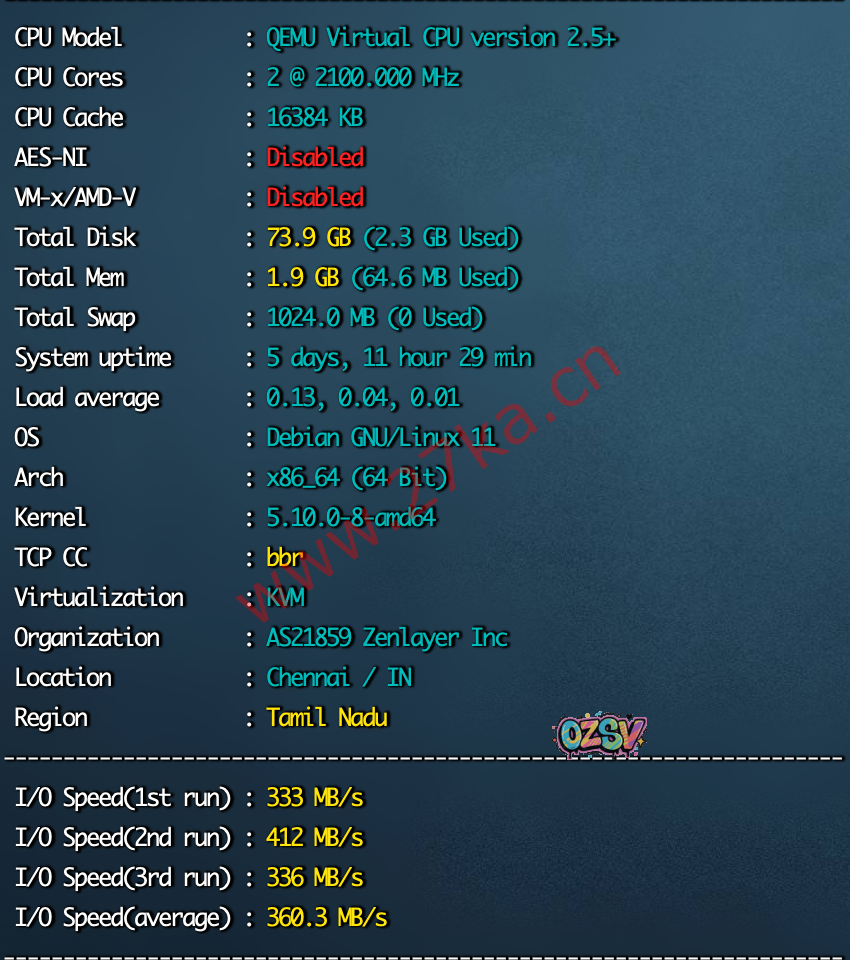 CPU型号未知,大致3.2GHz的主频,用的最低配2G内存这款做测评,开启了BBR,zenlayer自己的广播IP,硬盘I/O大致360MB/S的样子,大家熟悉下: