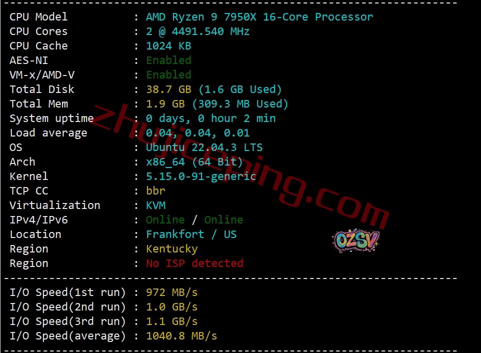 AMD Ryzen 9 7950X(16核、32线程、主频4.5GHz、加速频率5.7GHz),启用了BBR,IP归属美国,支持IPv4&v6,当前硬盘I/O大致1040MB/S: