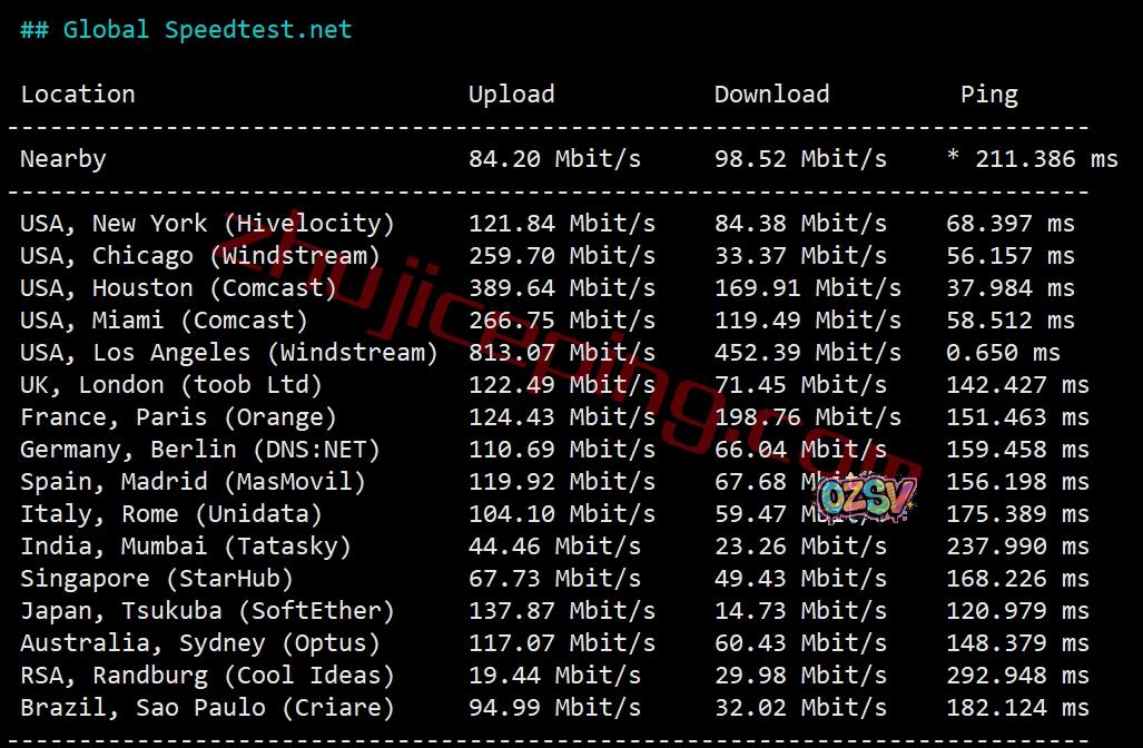 speedtest的部分国际节点的测试数据: