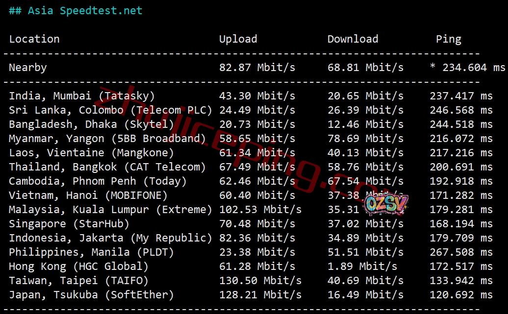 speedtest的部分亚洲区域内的节点的测试效果: