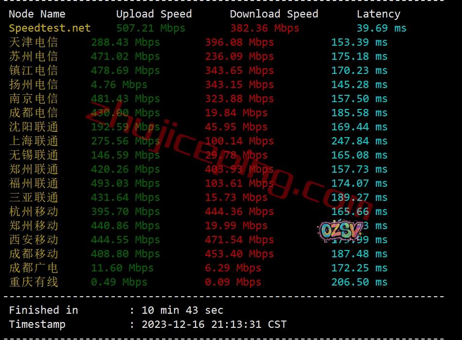 来看看晚高峰带宽情况,用speedtest在国内的三网节点测试带宽上下行,大致跑出来的效果: