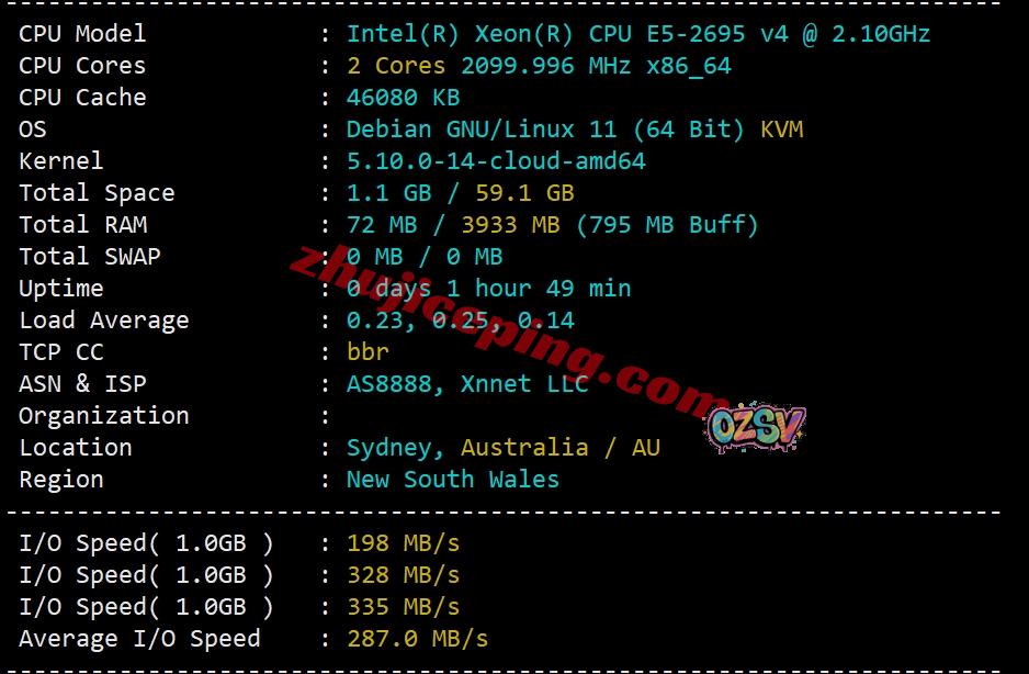 服务器用的CPU型号是e5-2695v4(双路则为36核、72线程、主频2.1GHz、加速频率3.3GHz),站长启用了BBR,归属地为澳大利亚,当前硬盘I/O大致287MB/S: