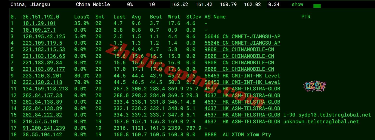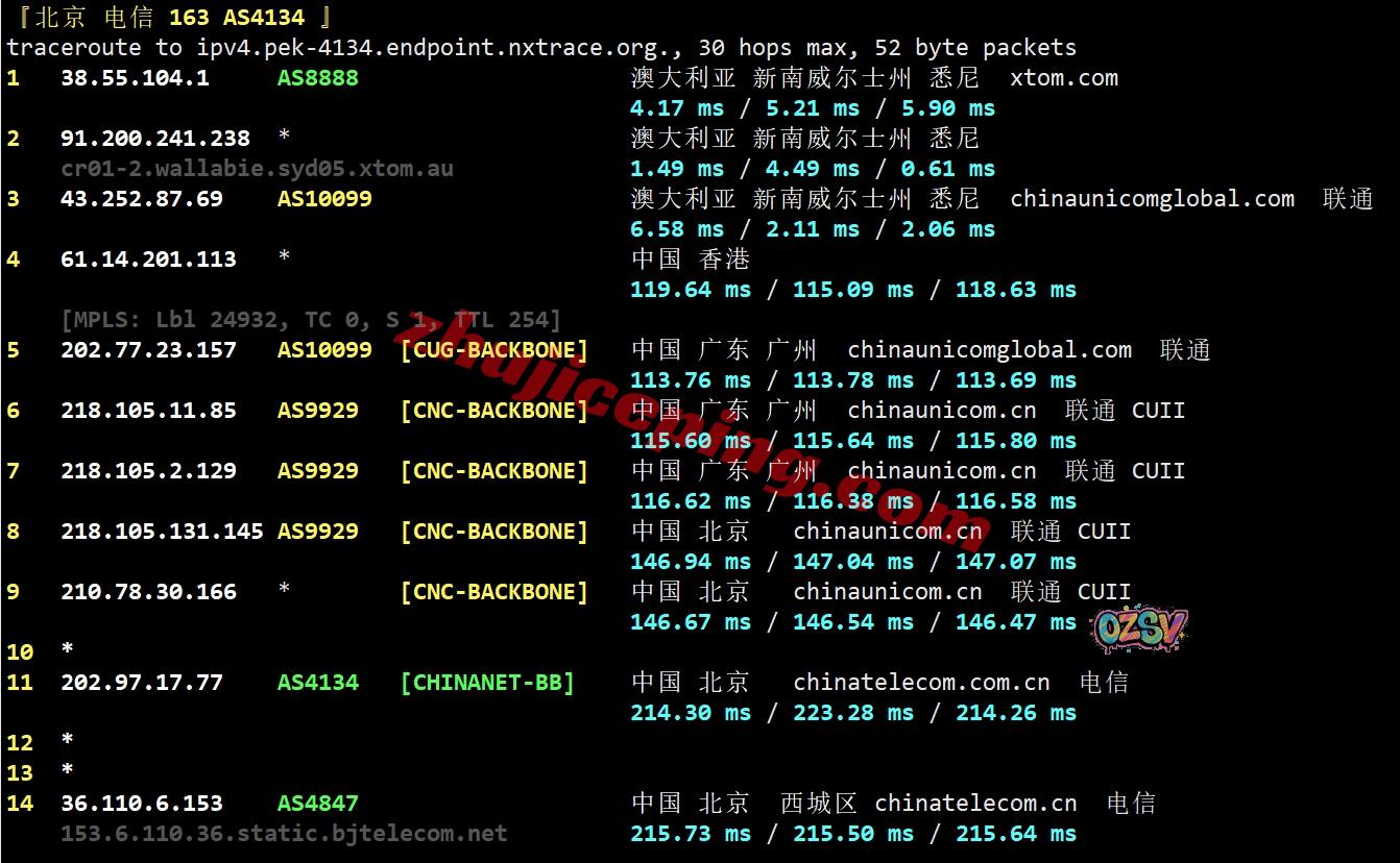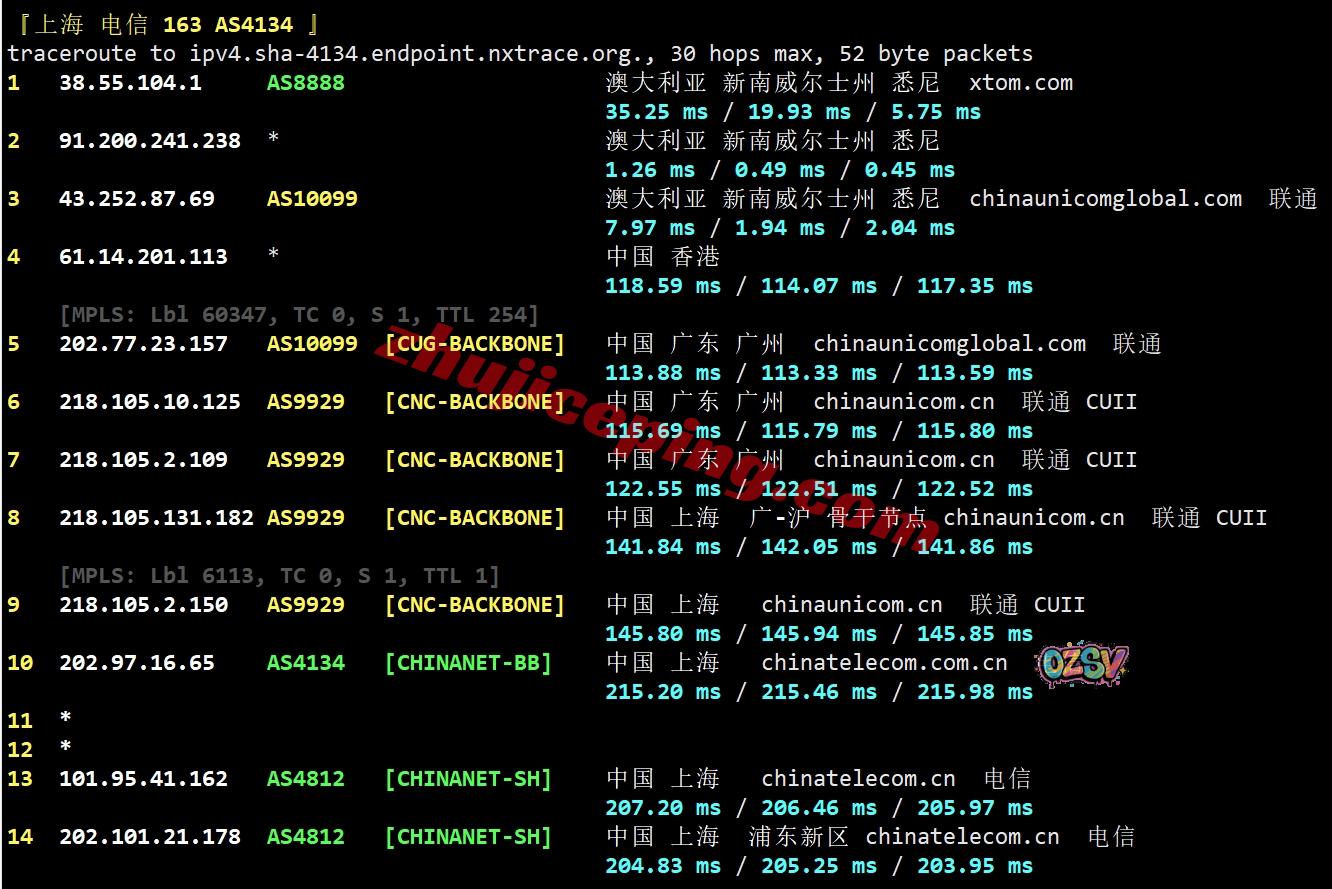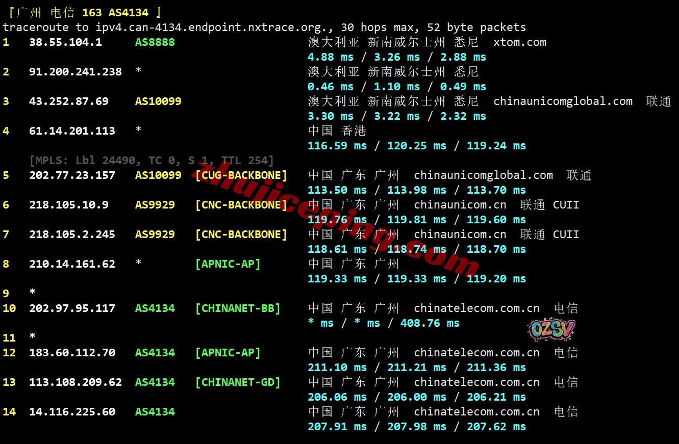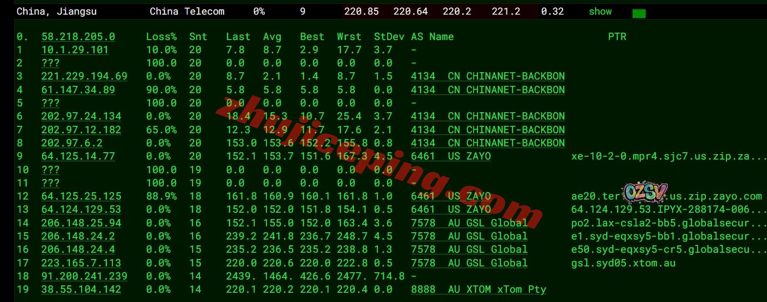 电信去程:直连电信圣何塞节点然后走zayo再转GSL去澳大利亚