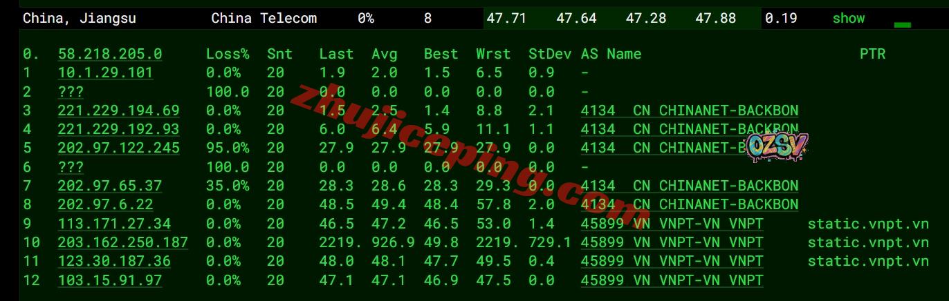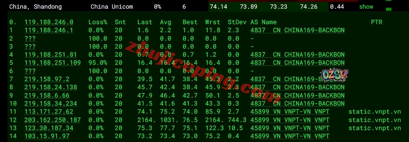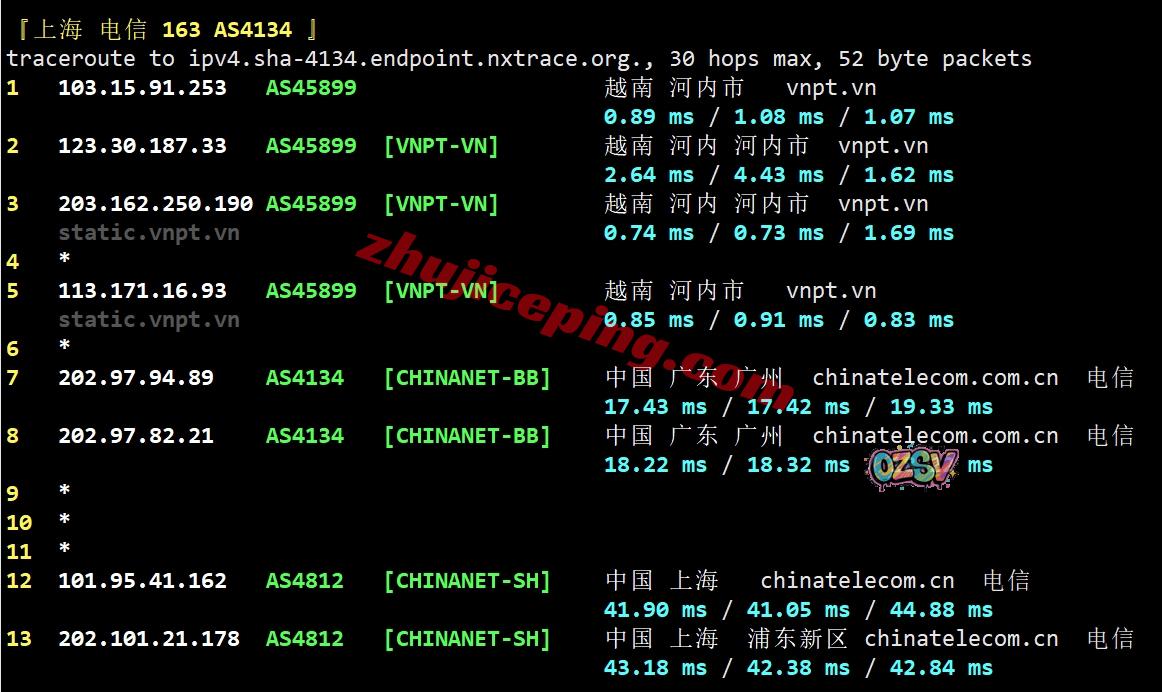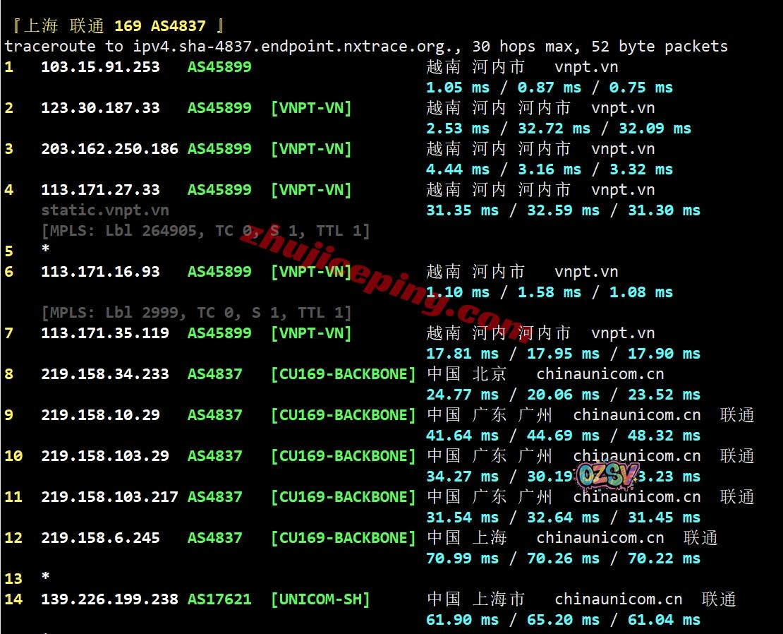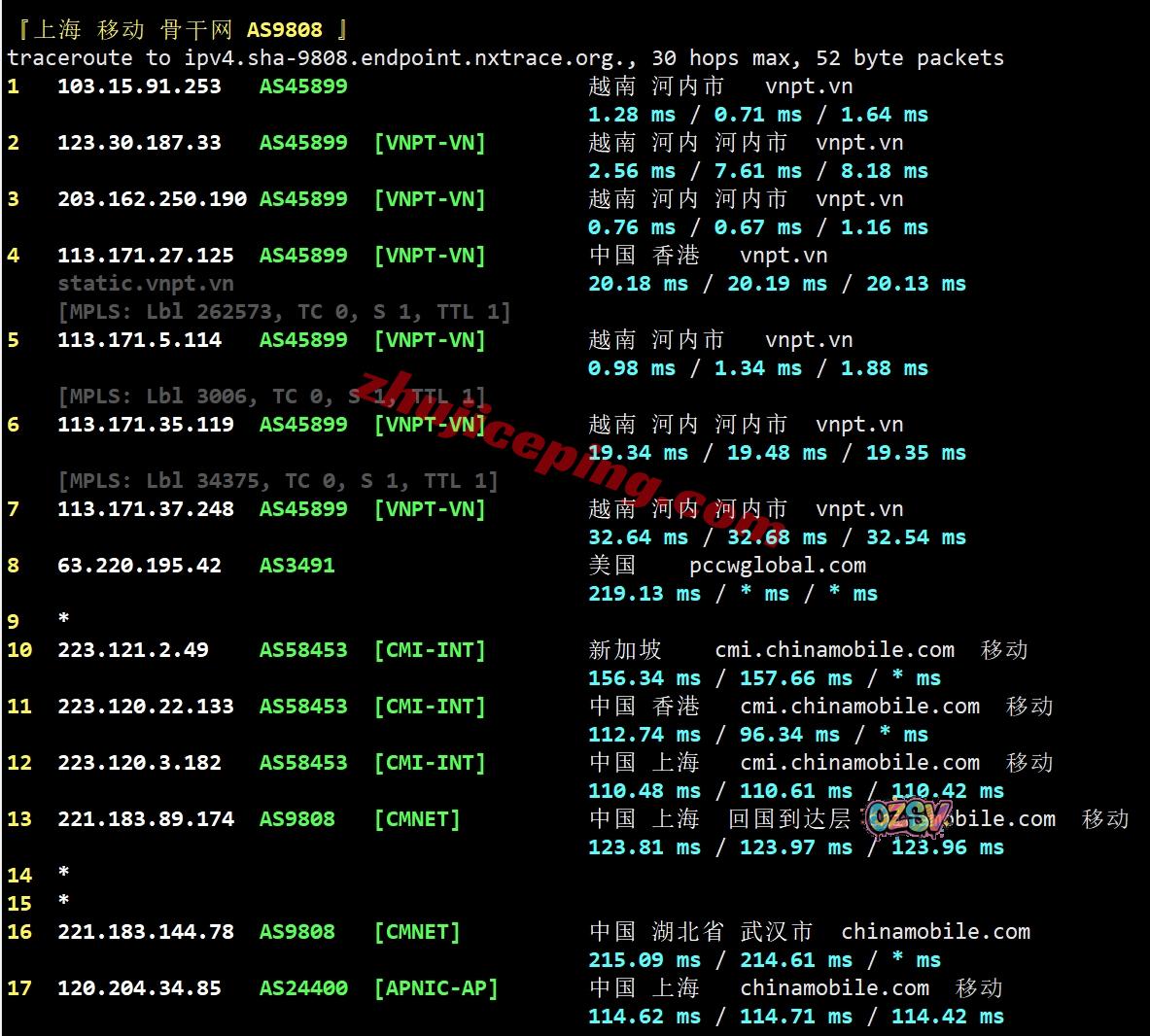 上海方向:越南vnpt接pccw去美国再返回新加坡移动CMI节点,然后经过香港CMI节点直连回内地
