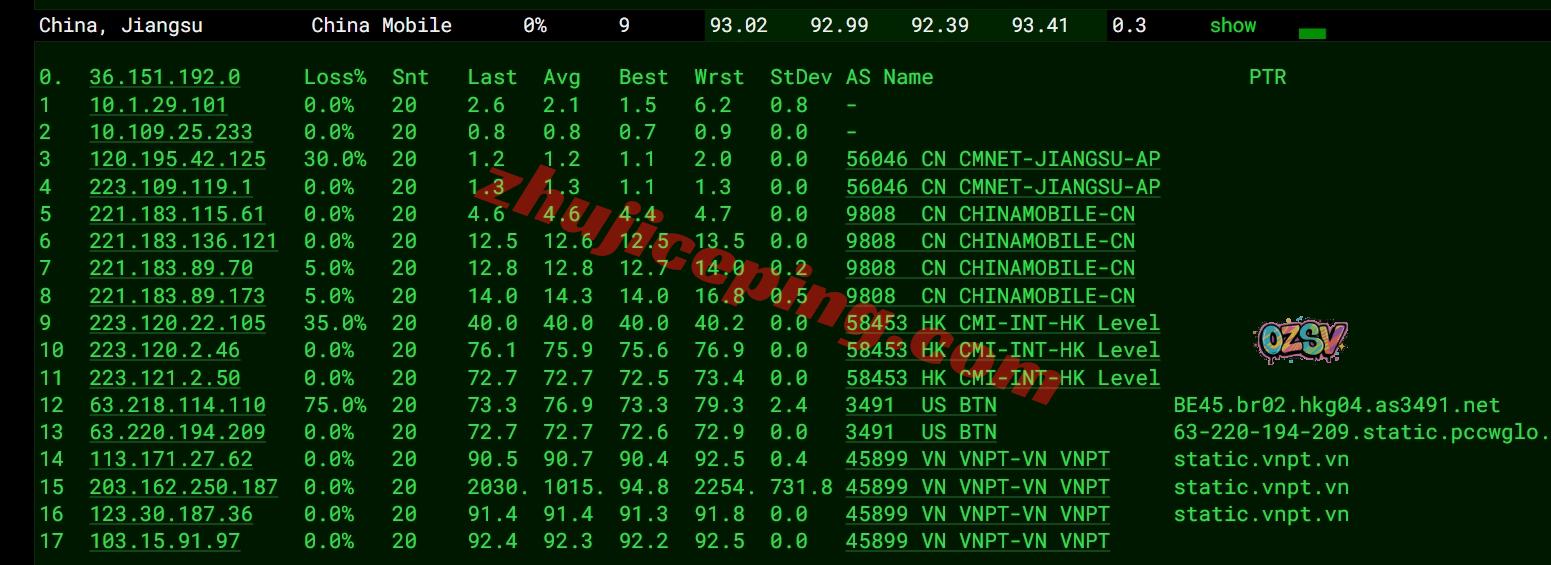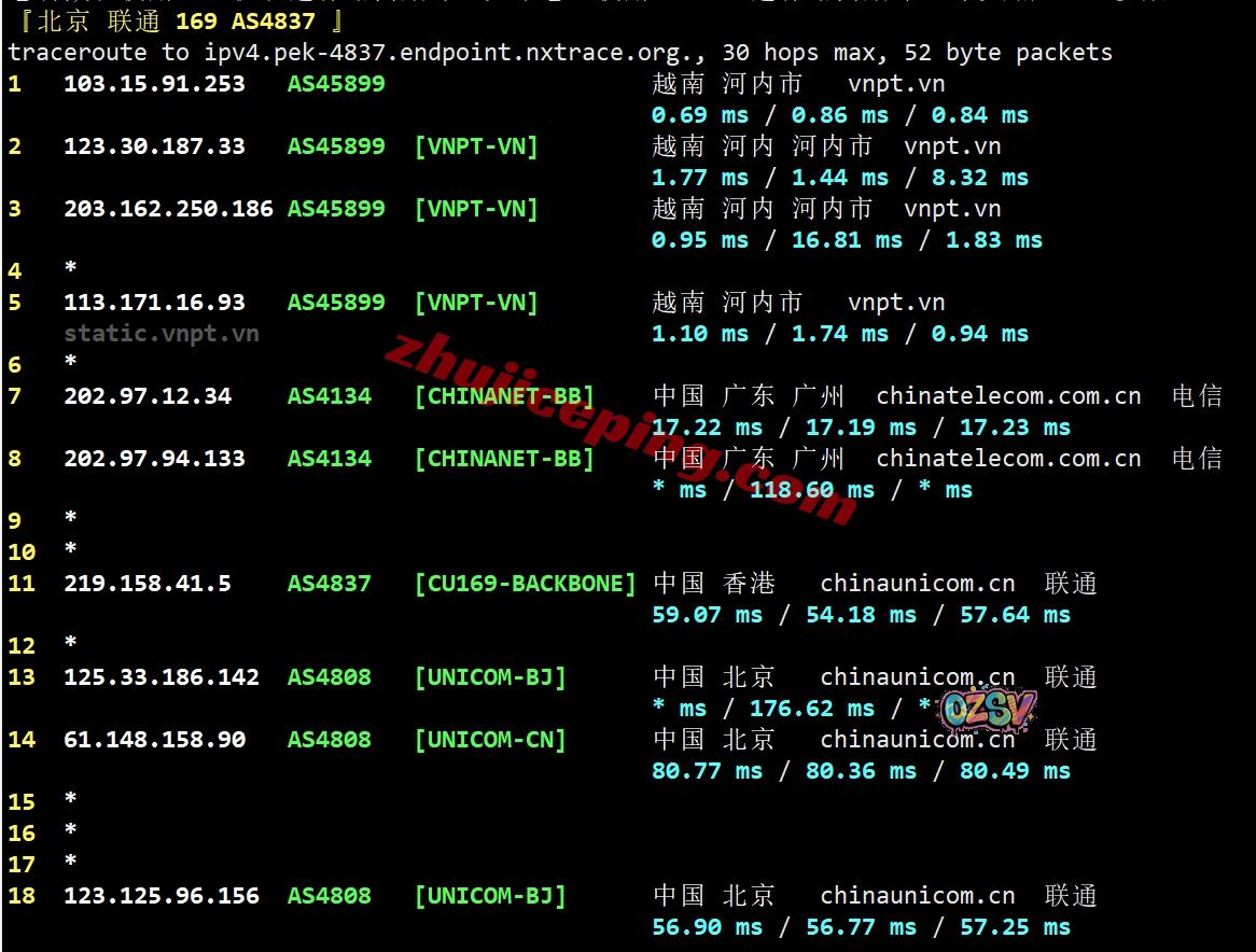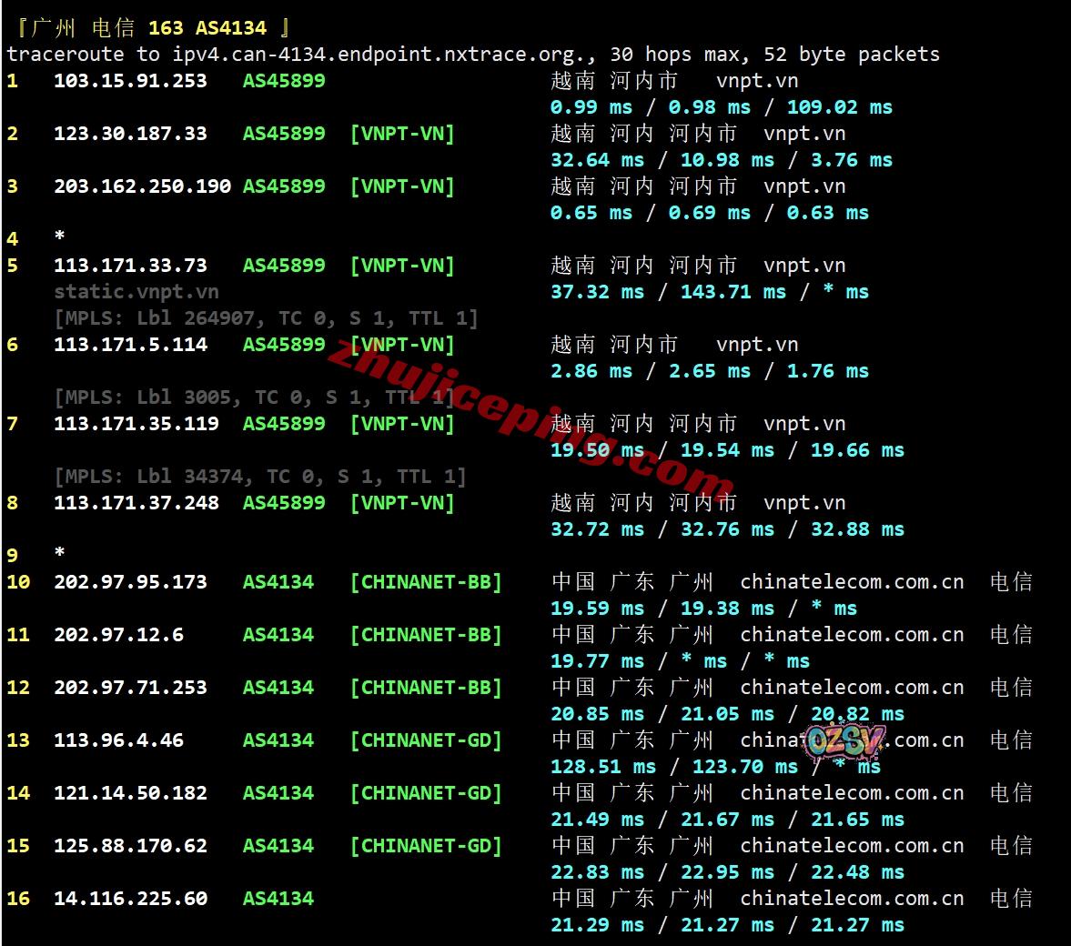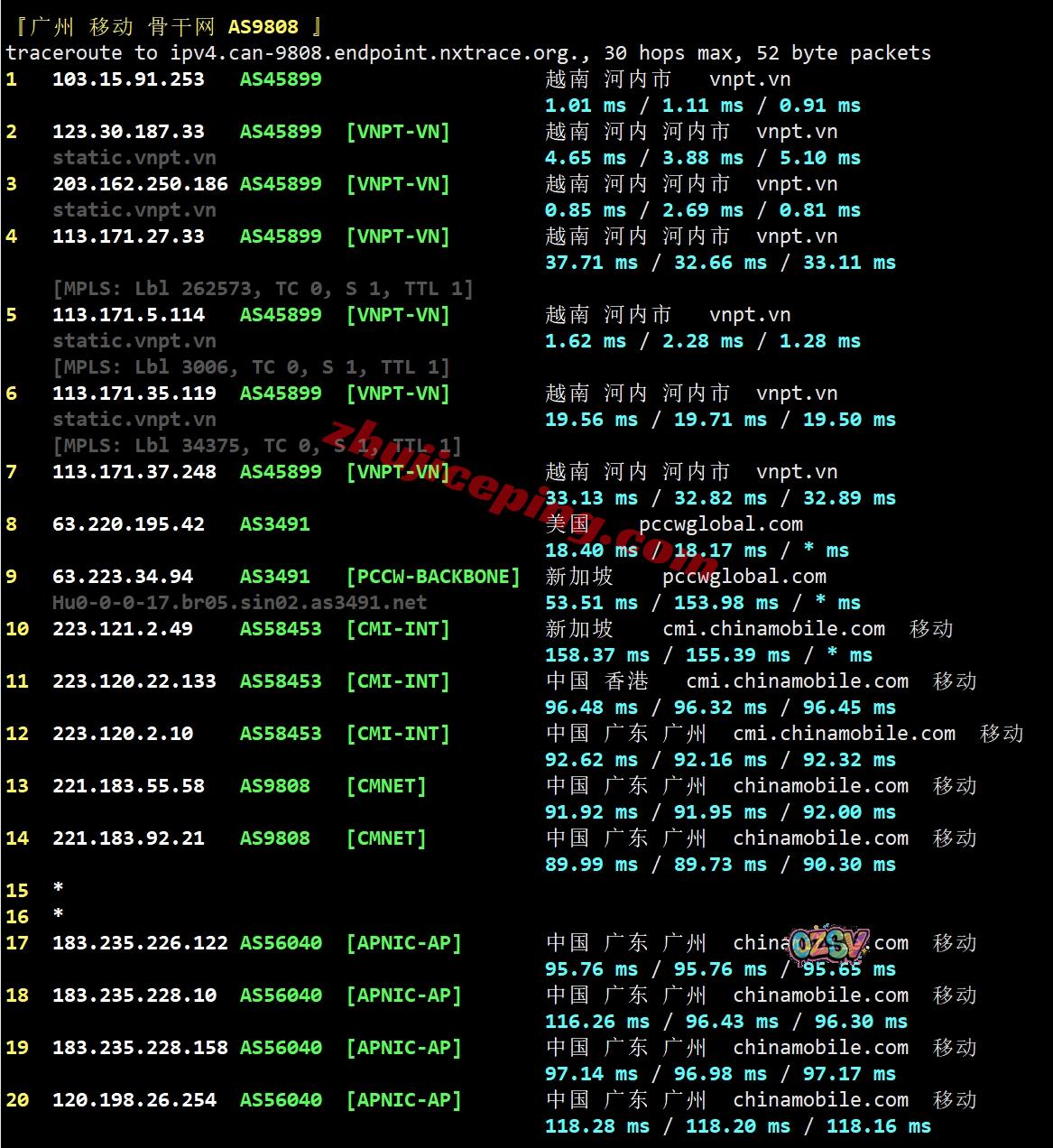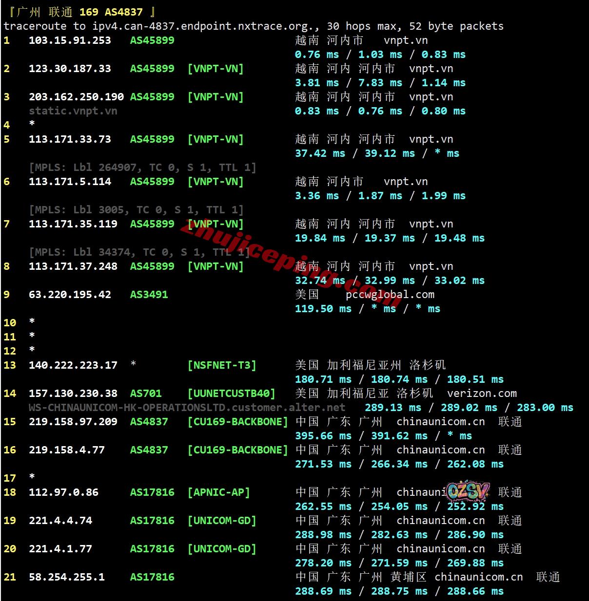 广州方向:越南vnpt接新加坡pccw然后转cmi直连香港CMI,接着直连回内地