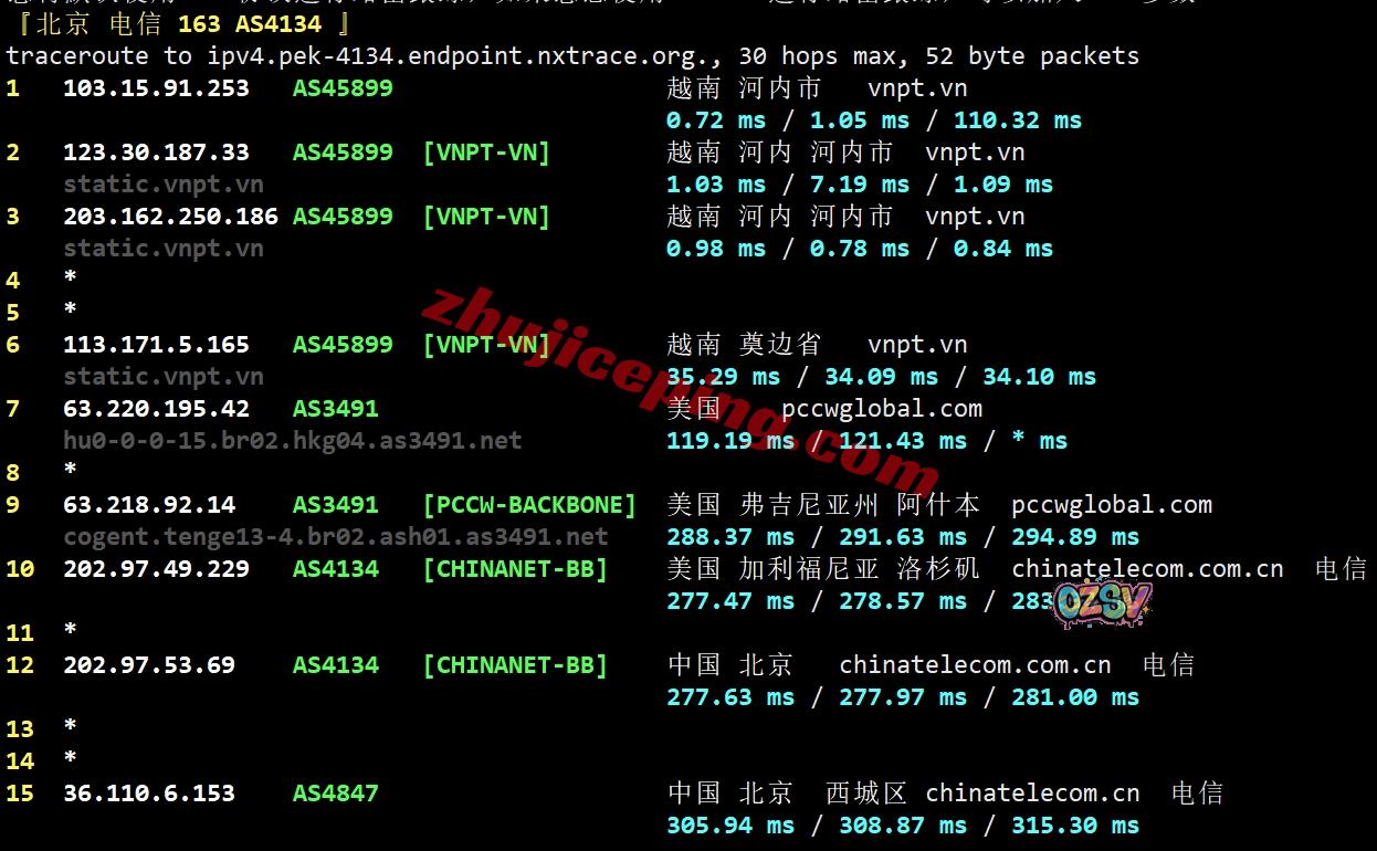 北京方向:越南vnpt去美国东海岸,走pccw到电信洛杉矶节点,然后直连回国