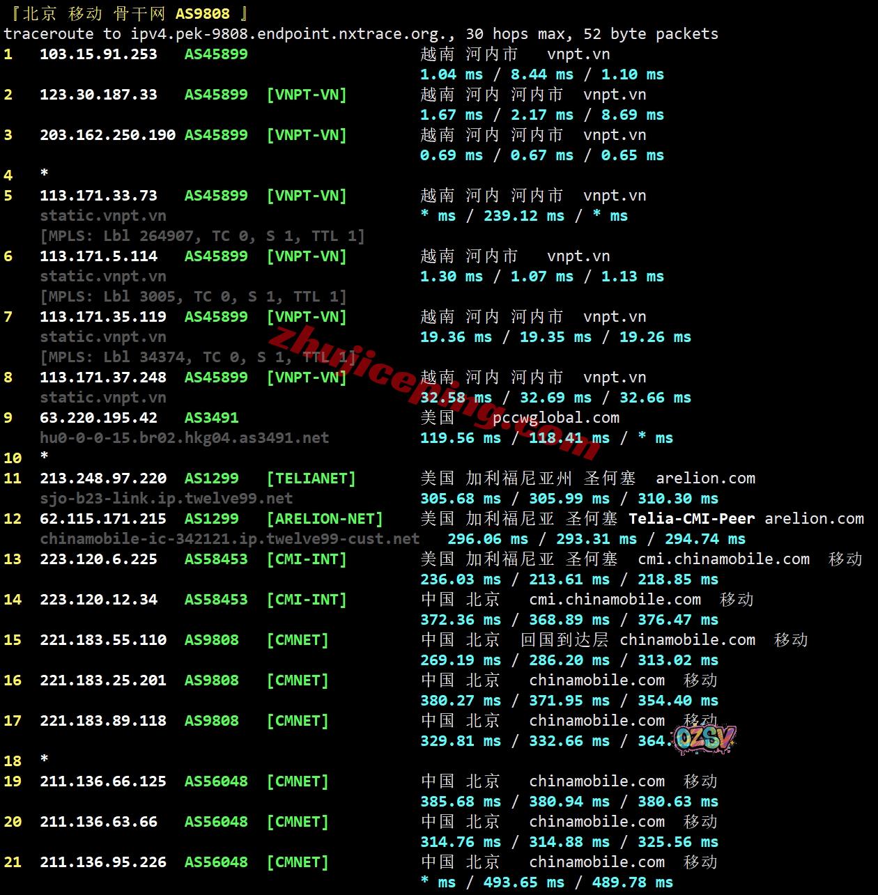 北京方向:越南vnpt接pccw到美国圣何塞,从移动与telia在圣何塞的peer出来直连回国