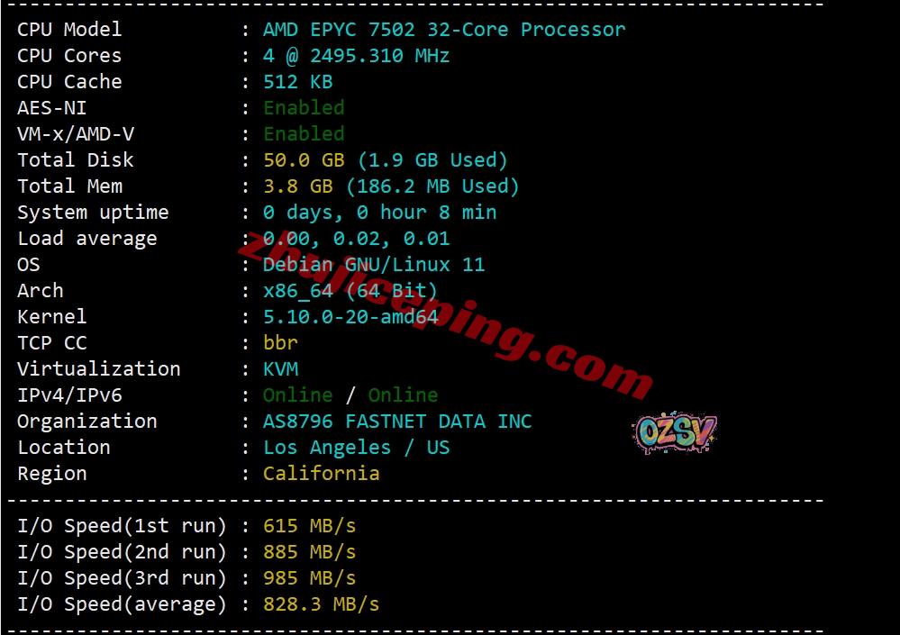 服务器母鸡型号为AMD EPYC 7502(主频2.5GHz、加速频率3.35GHz,32核、64线程),启用了BBR,支持v4和V6,当前I/O测试大致在828MB/S的样子:
