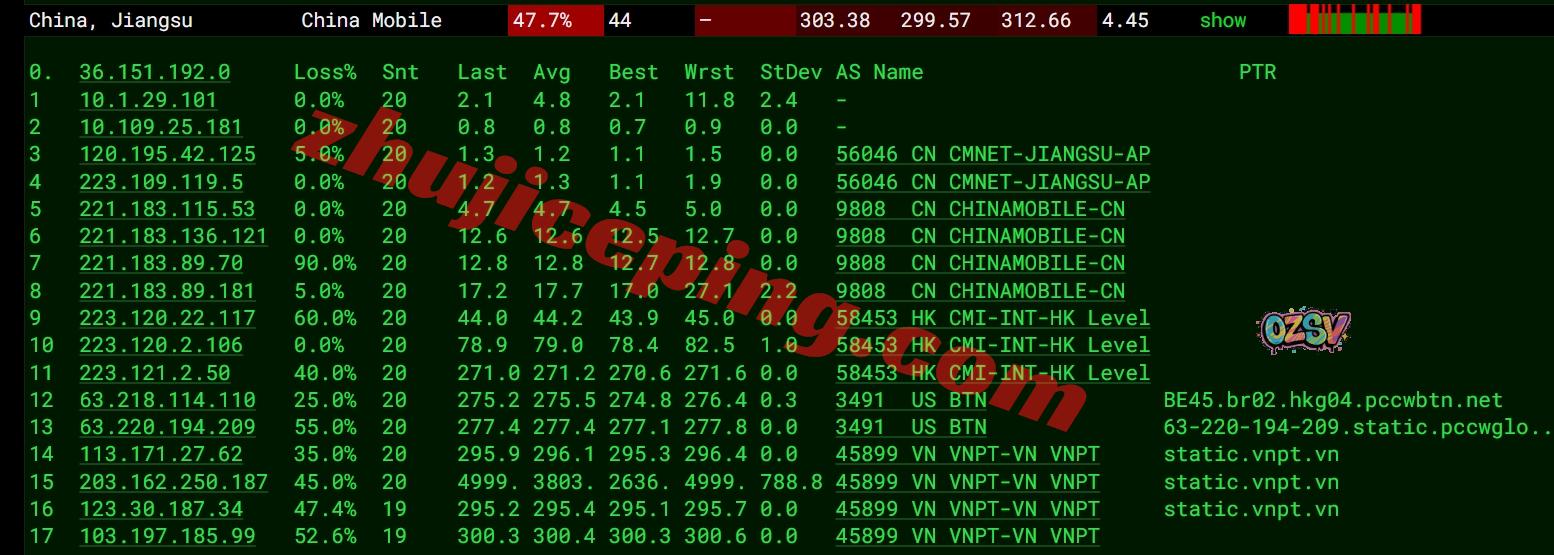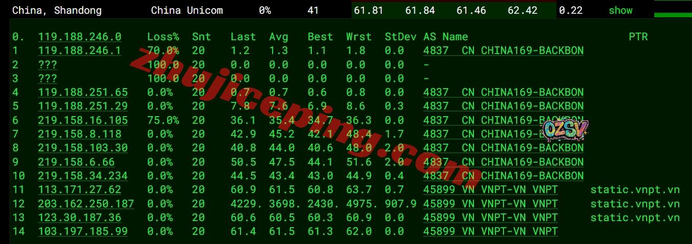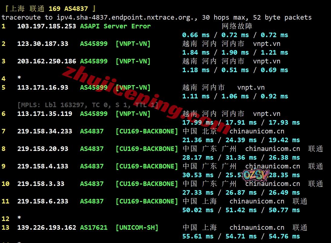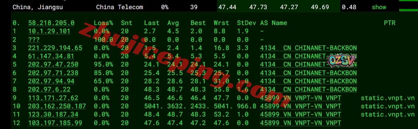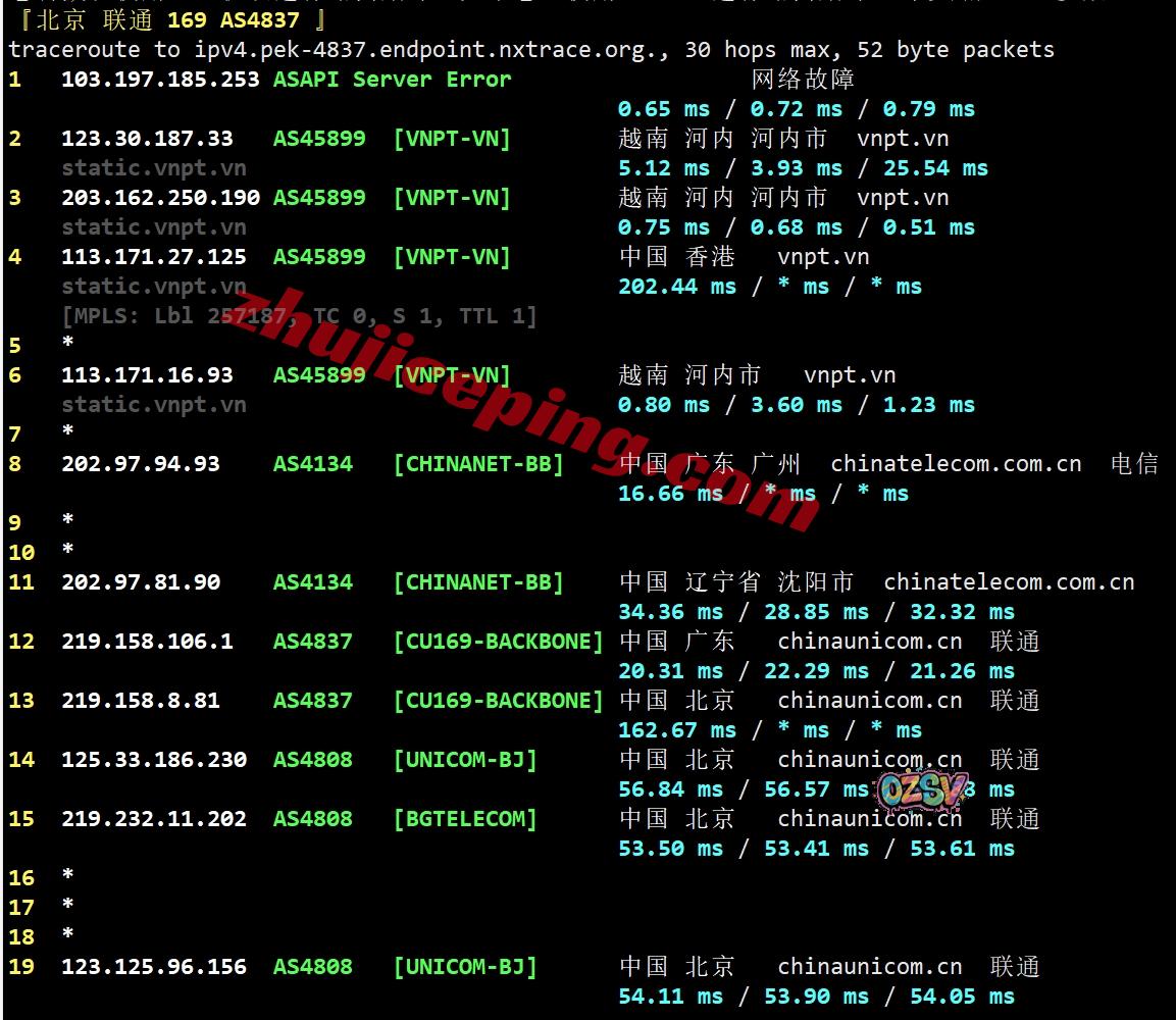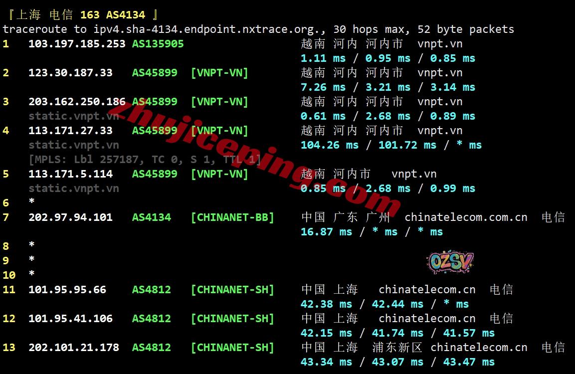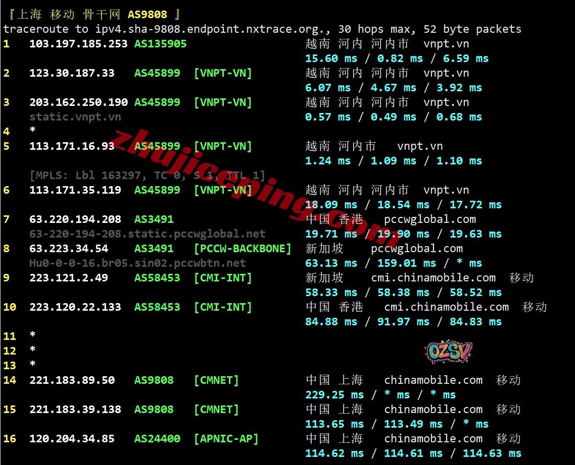 上海方向:越南vnpt对接香港pccw然后去新加坡转移动CMI节点再回香港CMI后直连回内地