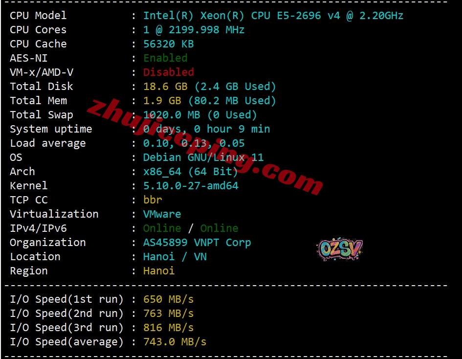 CPU为e5-2696v4,站长启用了BBR,基于VMware虚拟,支持IPv4和V6,上游网络为vnpt,ip归属越南河内,当前硬盘I/O测试大致在743MB/S左右的样子: