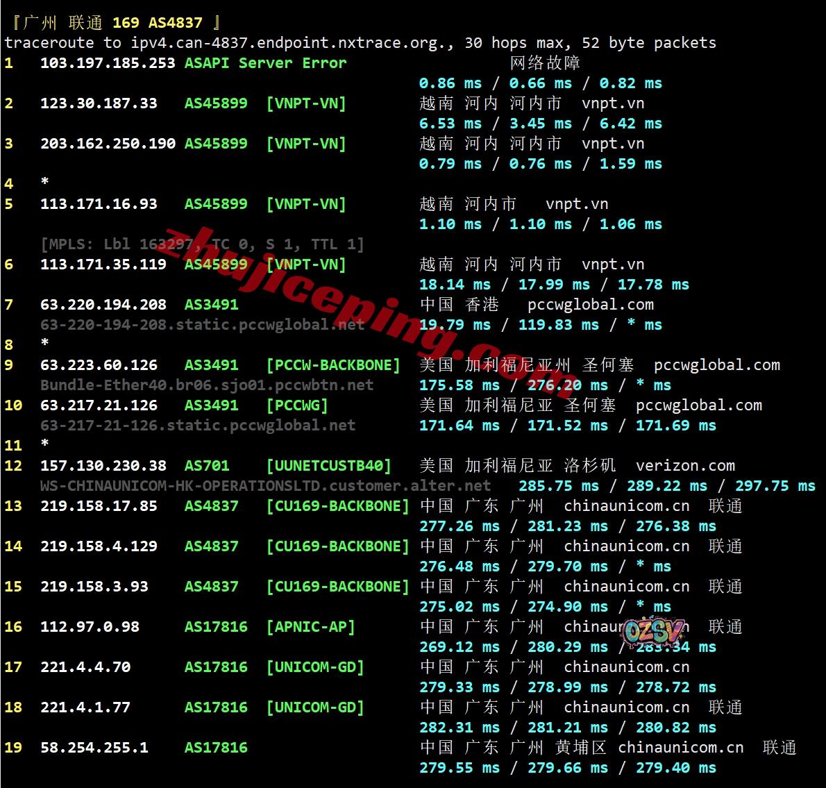 广州方向:越南vnpt到香港pccw然后去美国圣何塞pccw再通过Verizon与联通的peer回国