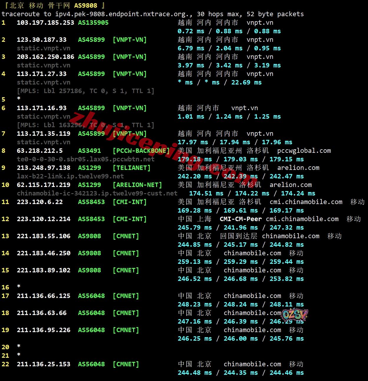 北京方向:越南vnpt对接美国洛杉矶pccw转twelve99再转移动CMI洛杉矶节点,然后直连回国