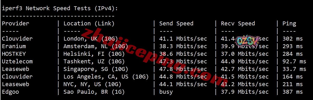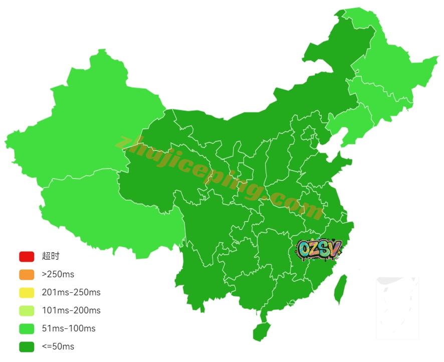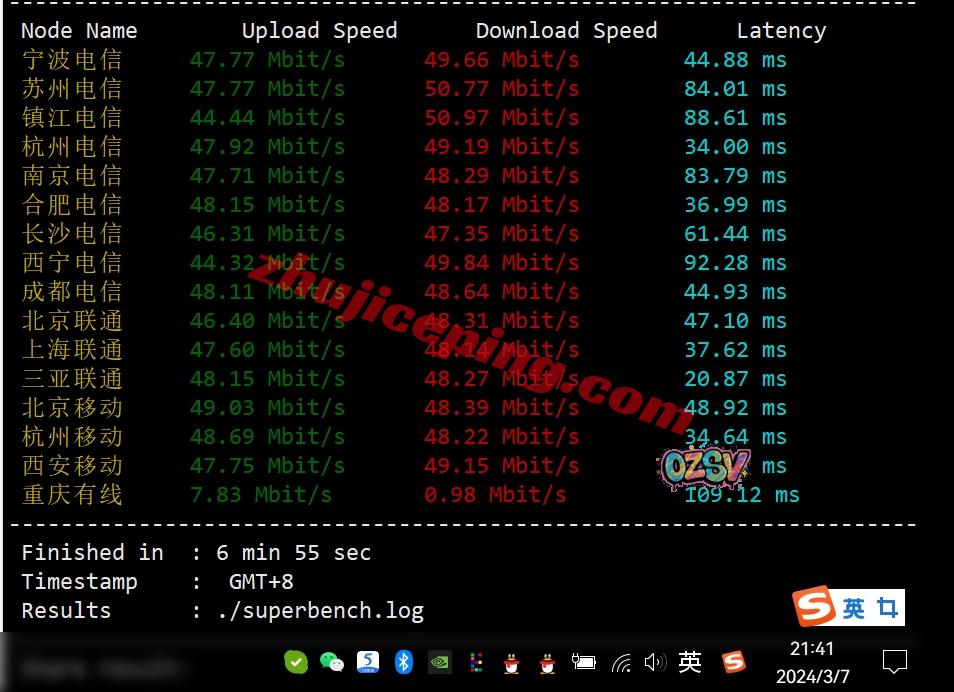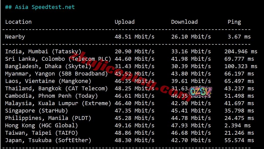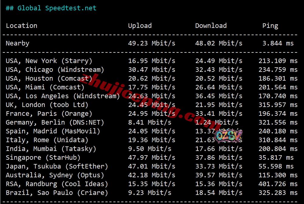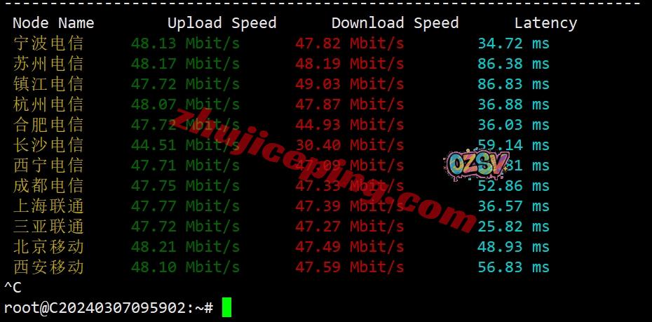 站长测试的这款配置默认提供50Mbps带宽,用国内三网多节点测试上下行带宽,大致数据: