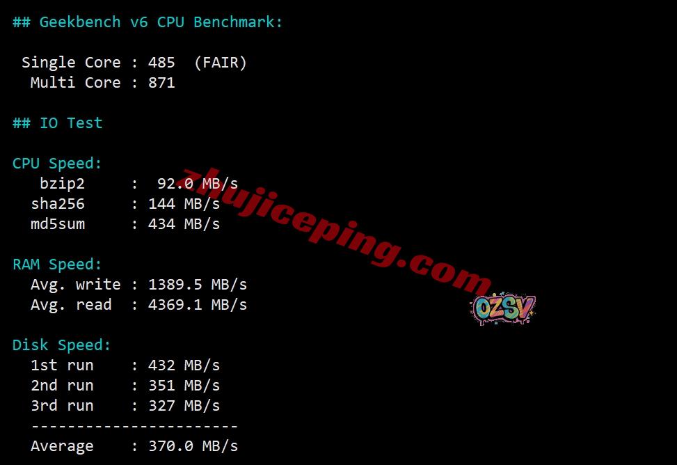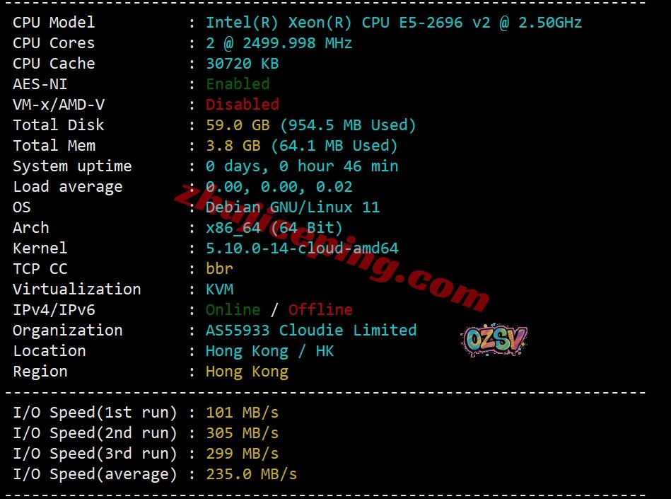 母鸡用的CPU型号是双路e5-2696v2(24核、48线程、主频2.5GHz、加速频率3.3GHz),启用了BBR,不支持IPv6,看起来用的cloudie的网络,当前I/O大致测试在235MB/S左右: