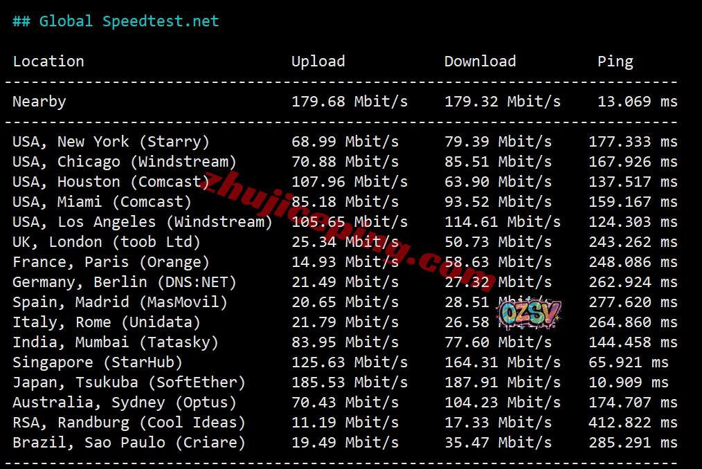 speedtest.net的部分国际节点的测试数据: