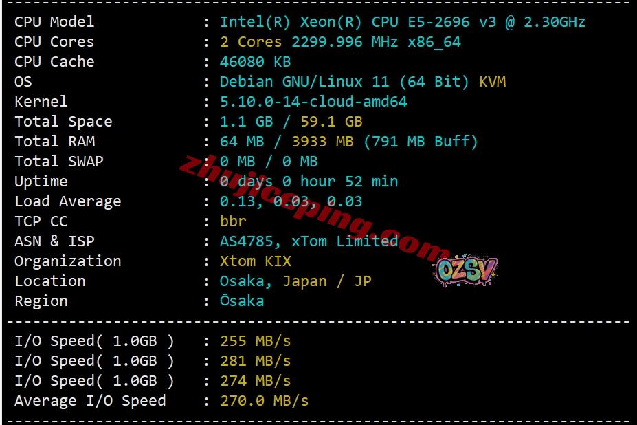 服务器用的CPU型号是e5-2696v3(双路36核、72线程、主频2.3GHz、加速频率3.6GHz),站长启用了BBR,上游网络是XTOM,归属地日本大阪,当前I/O大致在270MB/S的样子: