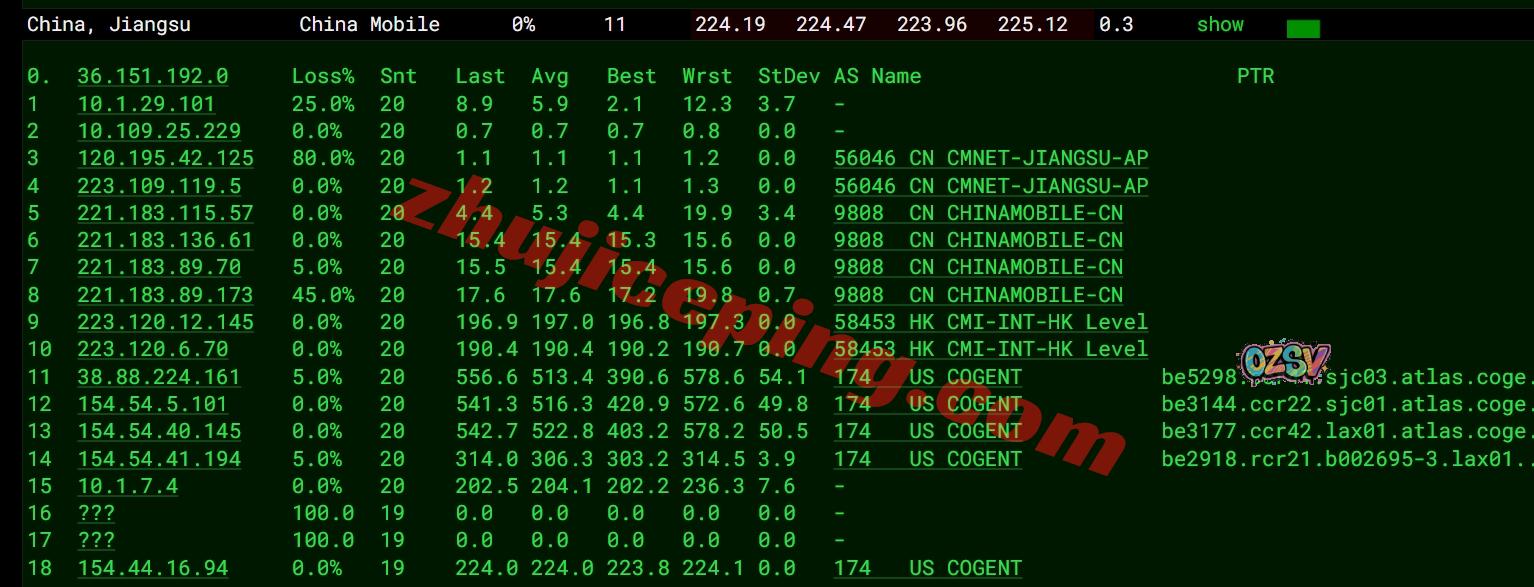 移动去程:直连移动美国纽约节点然后走cogent横跨全美去西海岸洛杉矶机房