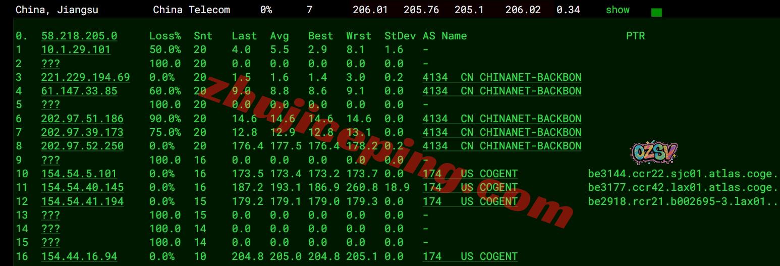 电信去程:直连电信美国圣何塞节点后转cogent去洛杉矶机房